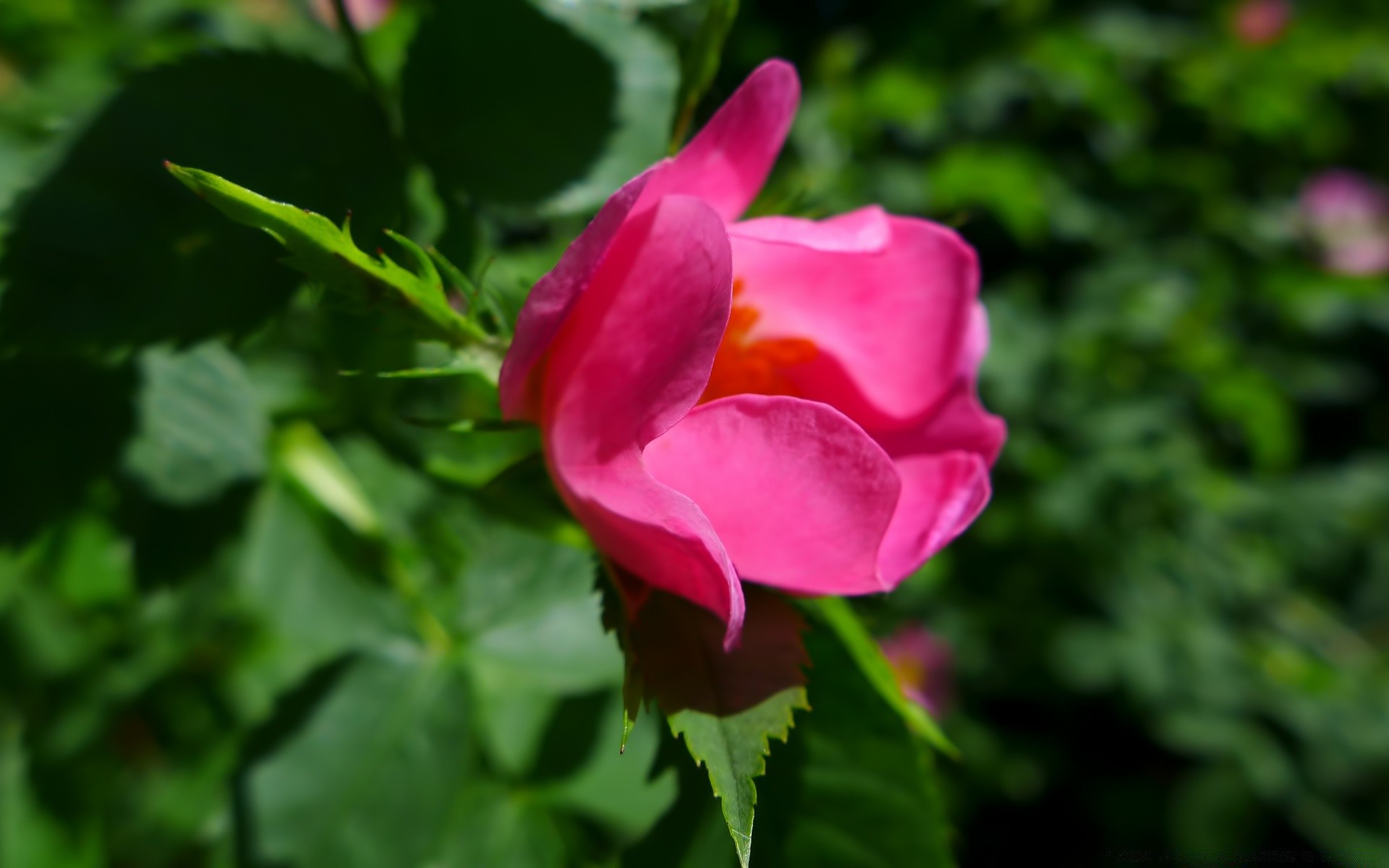 Roseira rosa em fundo desfocado