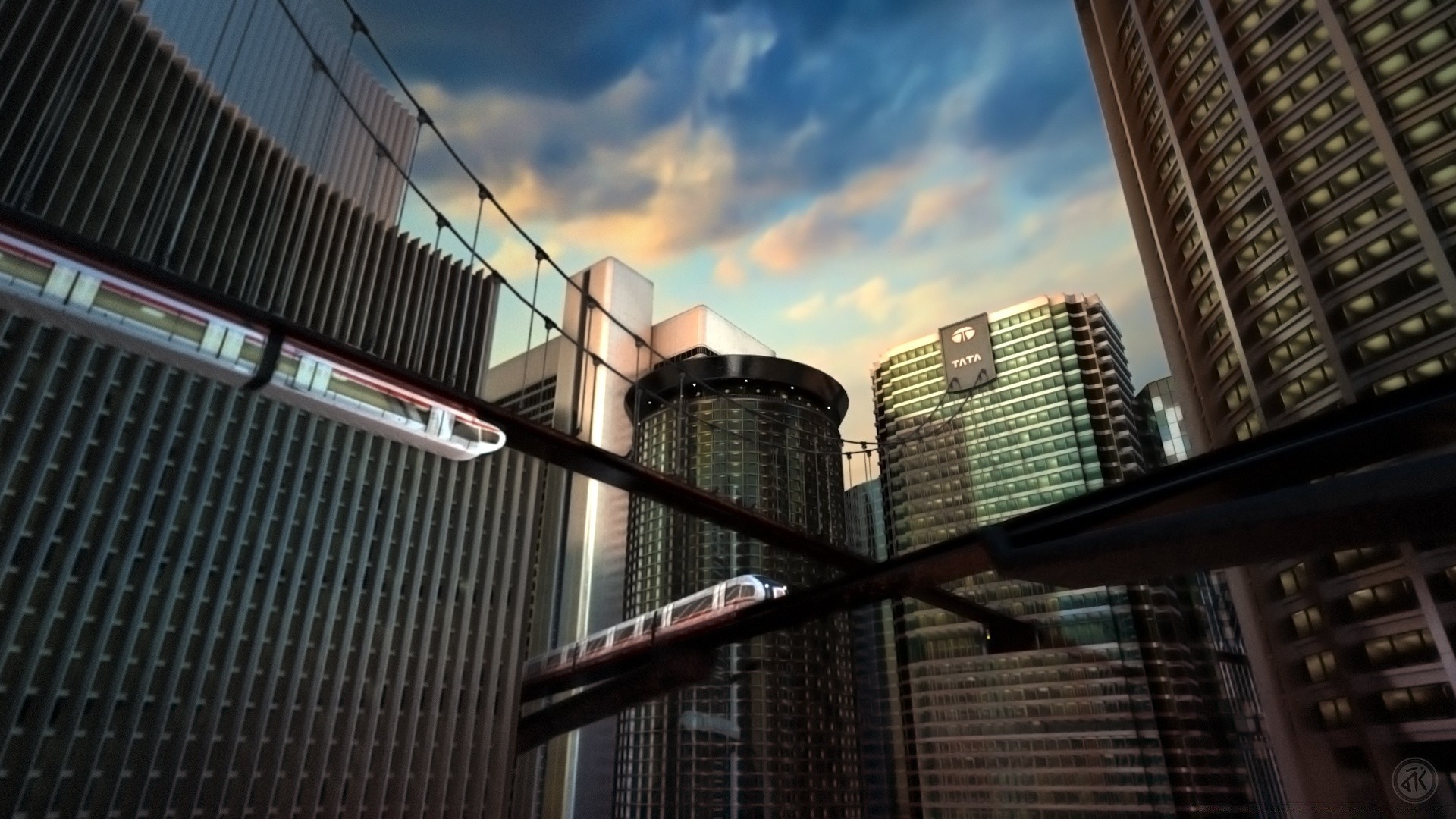 Ponte com trem em movimento na paisagem urbana