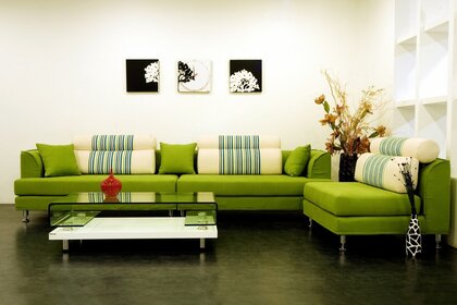 Sofá de canto verde na sala de estar