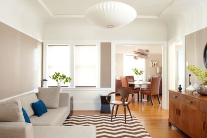 Sala de estar acolhedora em cores claras