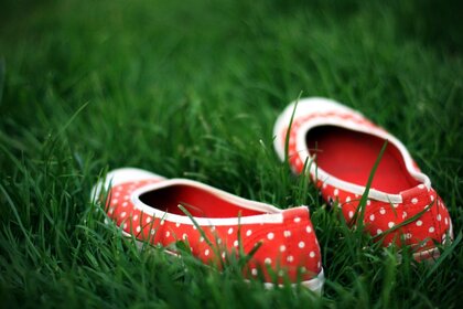 Sapatos vermelhos em bolinhas brancas na grama verde