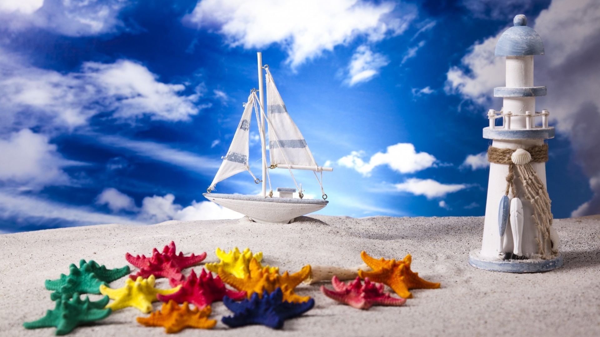 Colagem de fotos. Um iate com velas brancas. Areia branca. Céu azul com nuvens brancas. Estrelas do mar coloridas