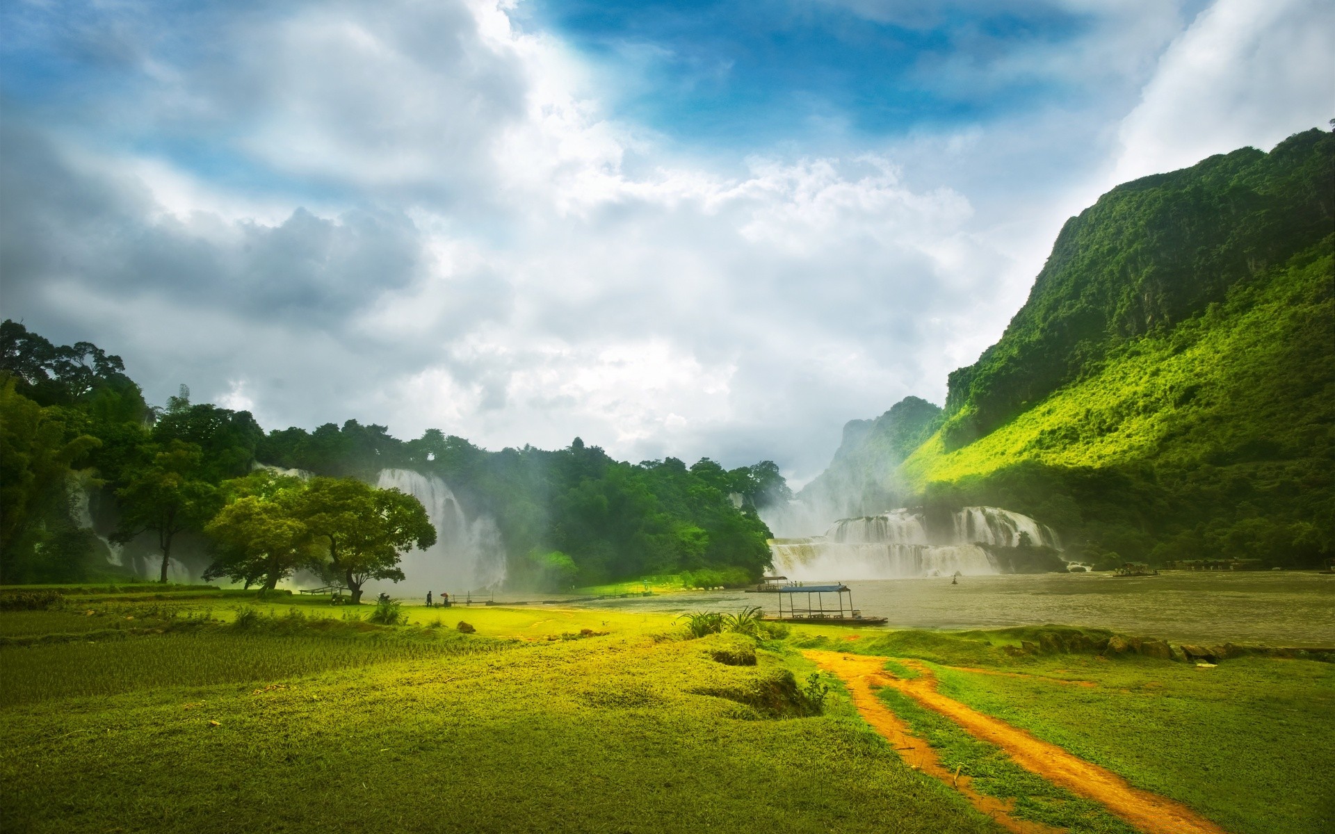 Ao longo das estradas que passam entre as rochas estão dois carros esportivos, um helicóptero paira sobre eles