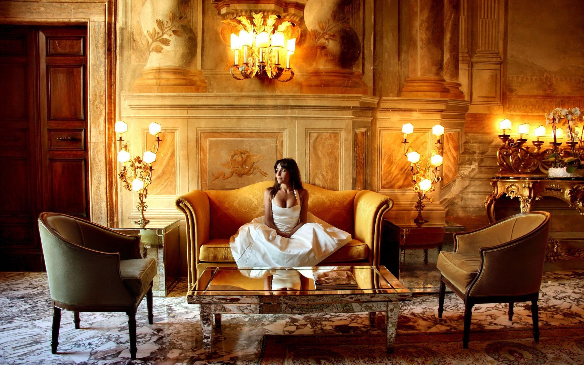 Morena sentada no sofá em um castelo cercado por lâmpadas