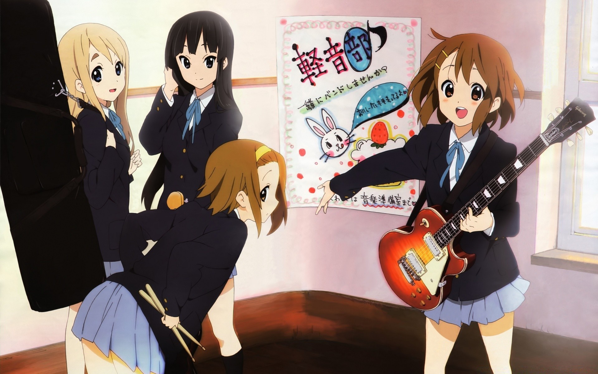Anime quatro meninas em saias curtas com instrumentos musicais