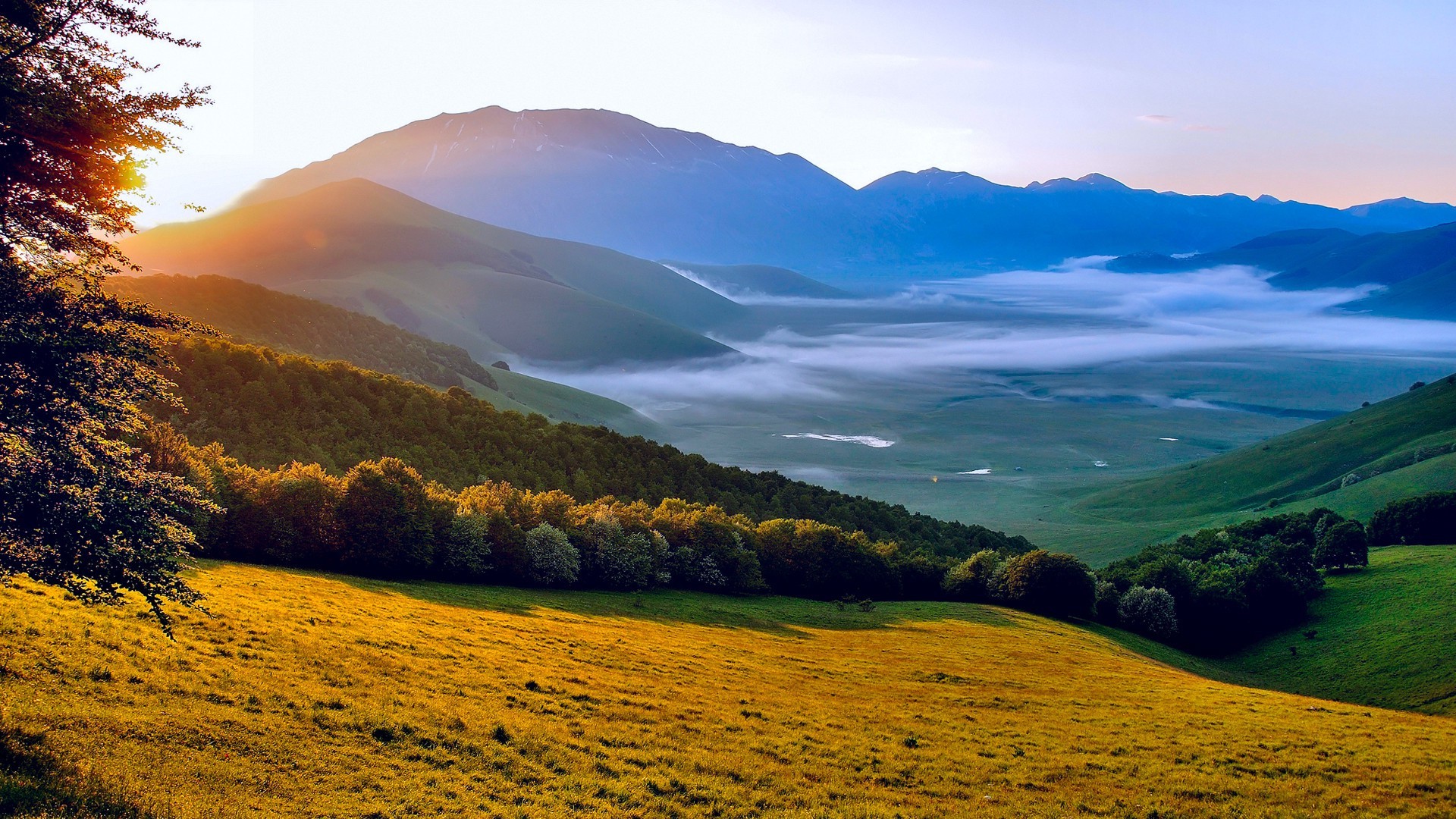Amanhecer. A névoa que se arrasta entre as colinas verdes