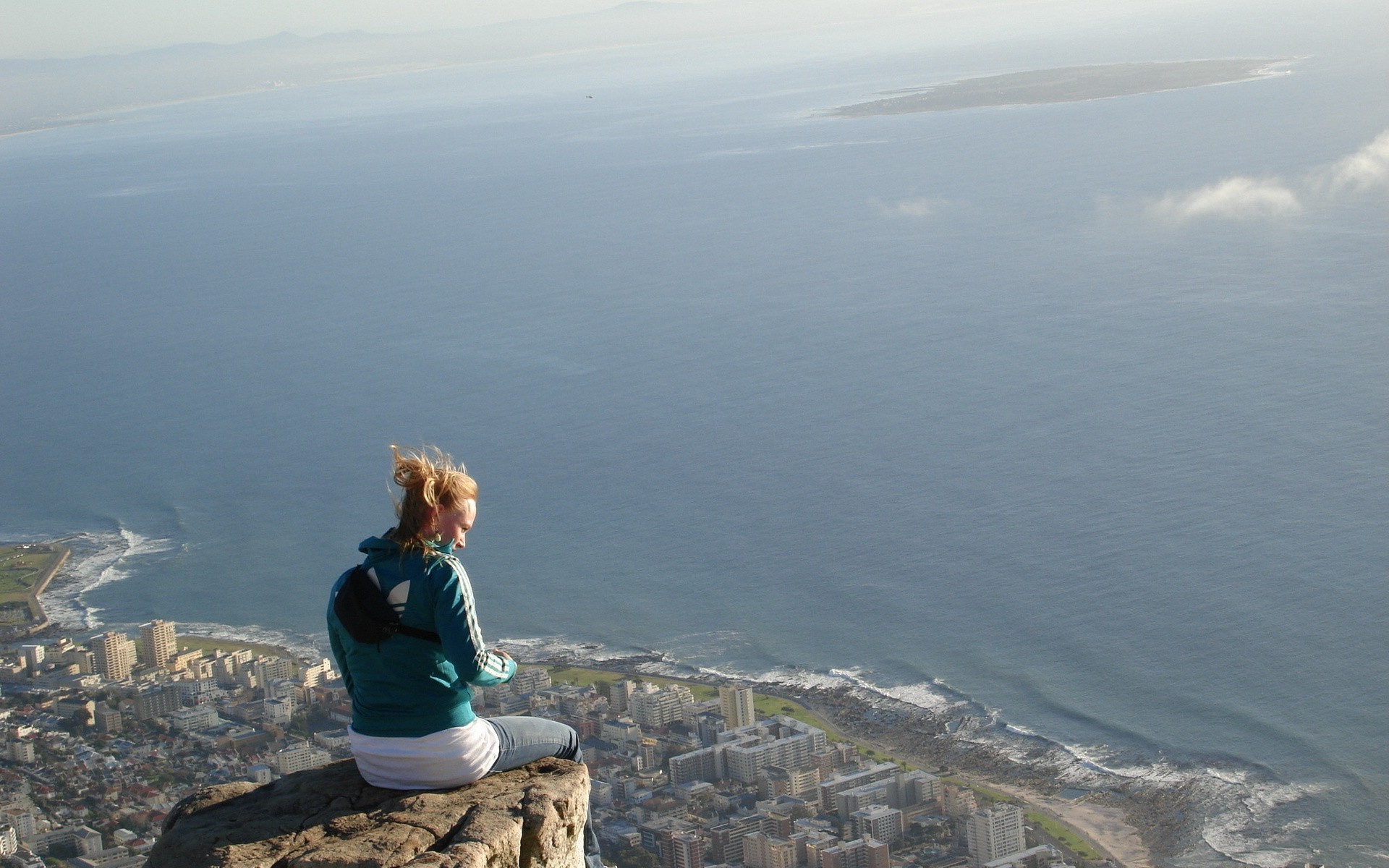 Menina corajosa senta-se na beira de um penhasco acima da cidade