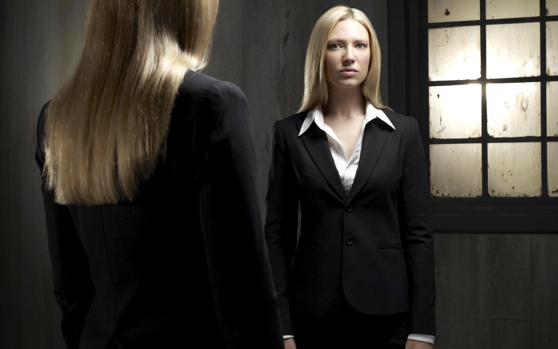 A mulher olha para o seu reflexo