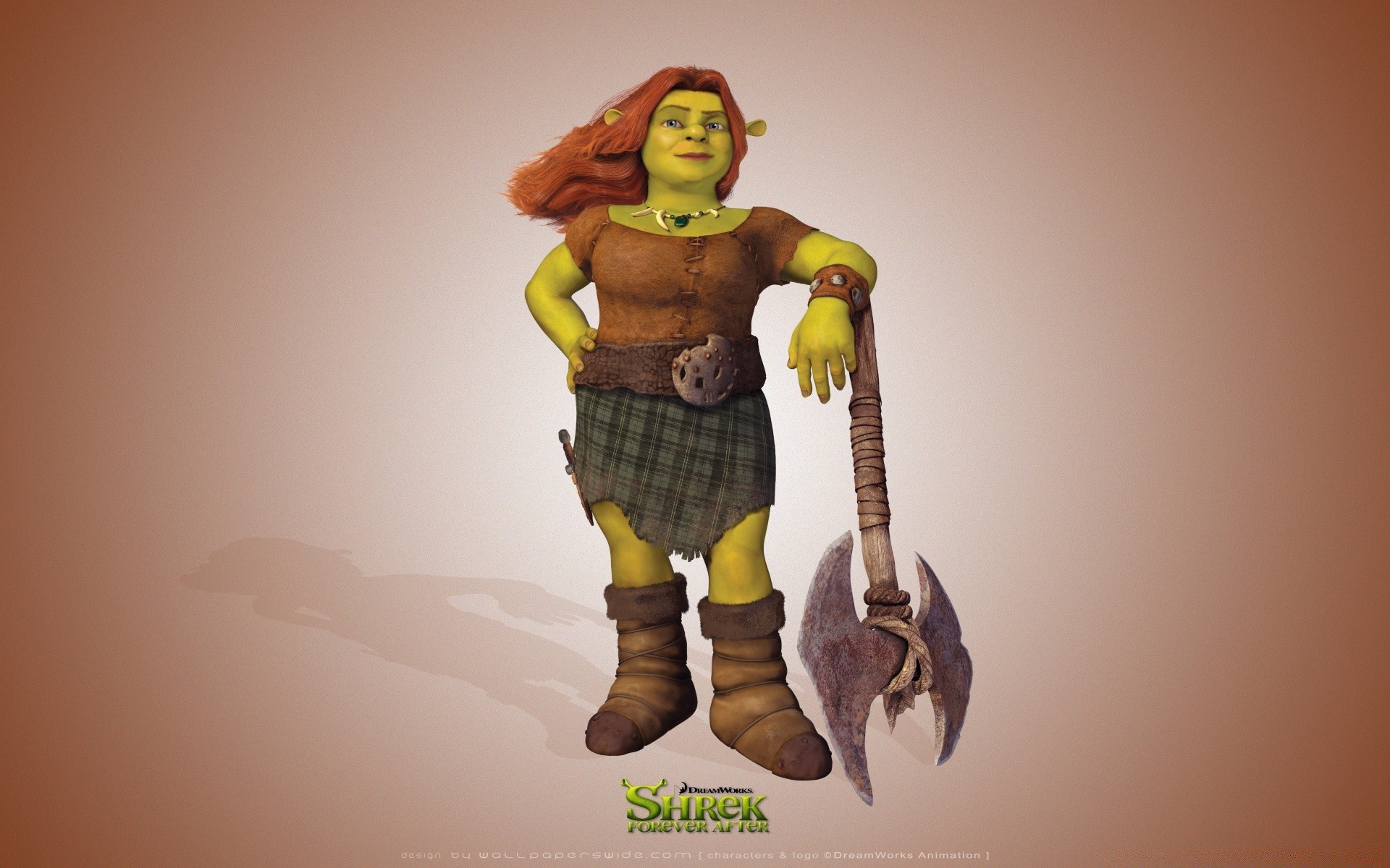 Personagem de desenho animado Shrek. Fiona está de pé com uma arma na mão