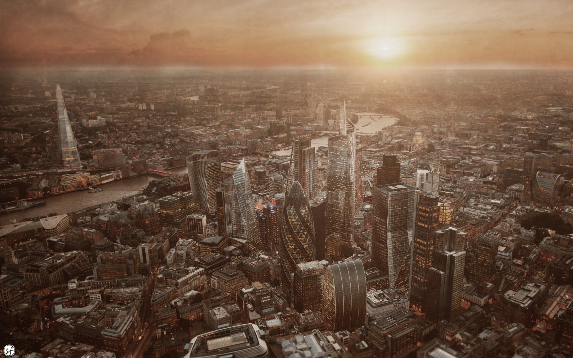 Paisagem urbana com edifícios altos no fundo do pôr do sol