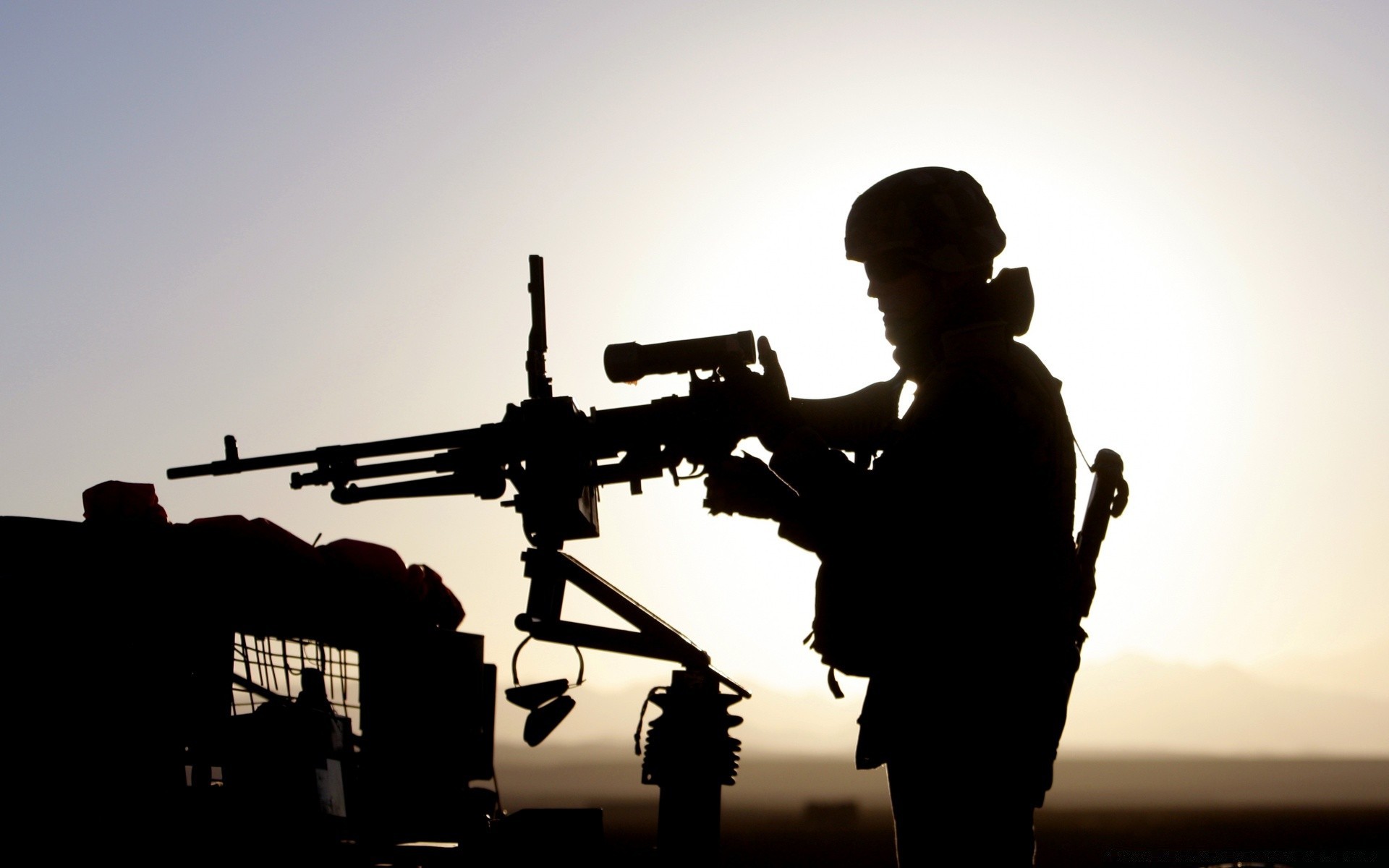 Um inverno frio e nevado, um soldado na neve, uma arma ao lado