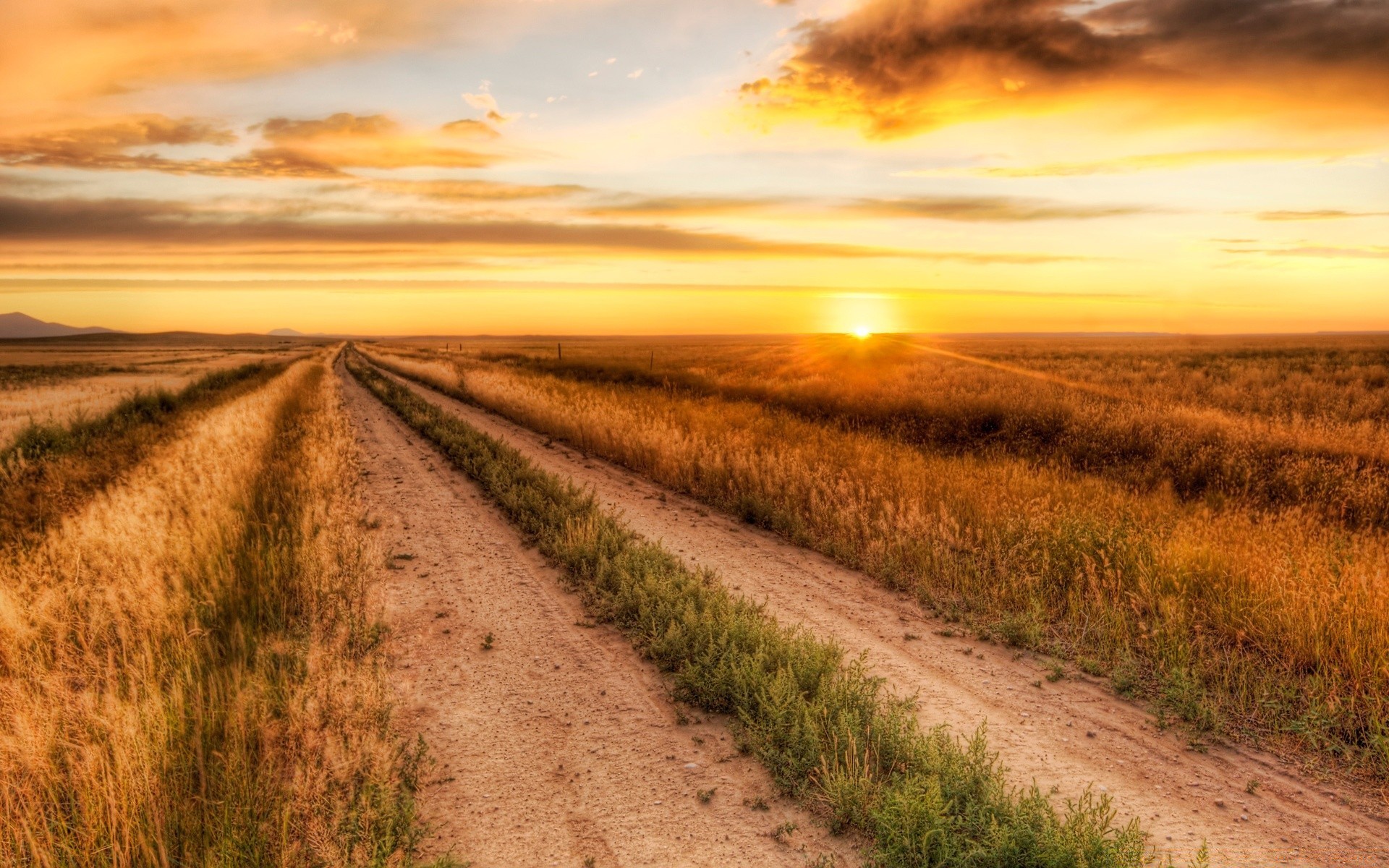 Céu azul, sol ofuscante. Campo verde iluminado pelo sol escaldante