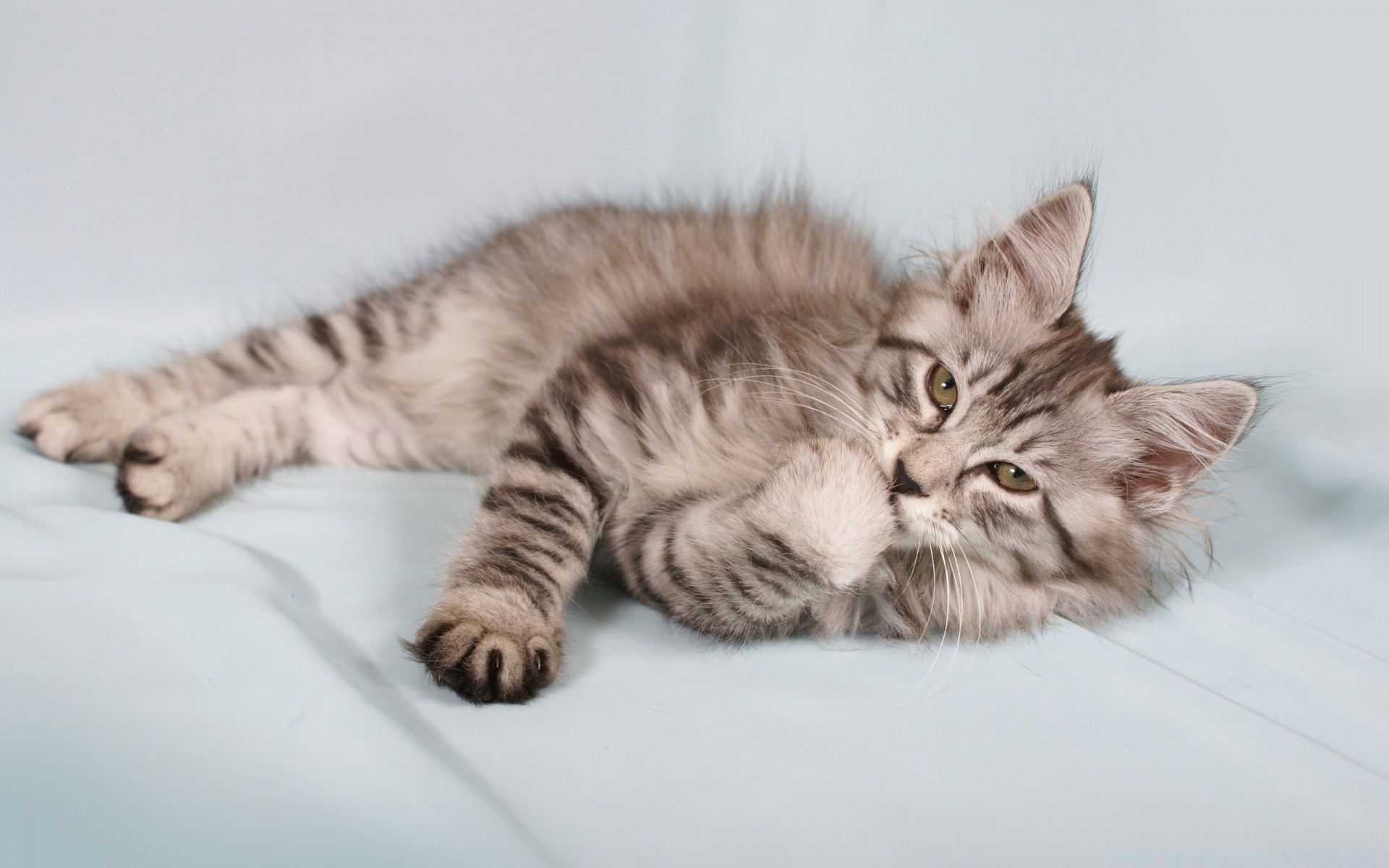 No fundo azul, o gato olha para baixo