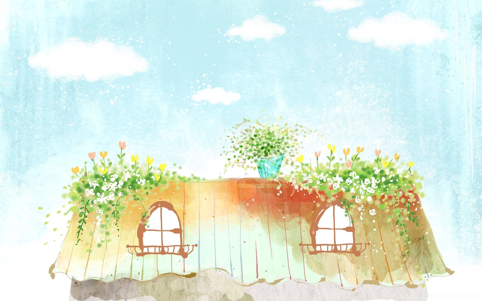 Desenho do telhado em um dia claro em uma panela e flores