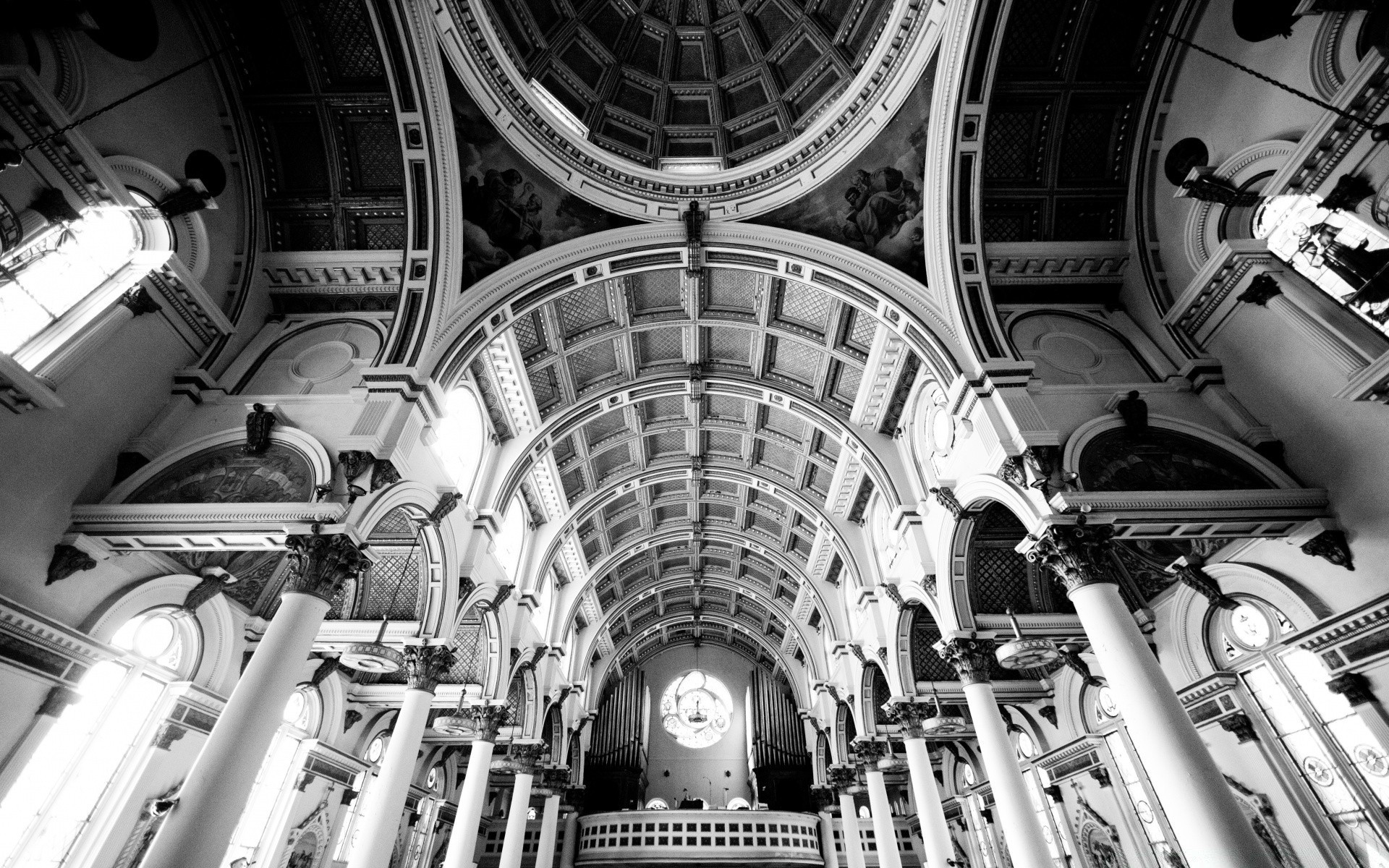 Foto em preto e branco de uma paisagem urbana com arranha-céus