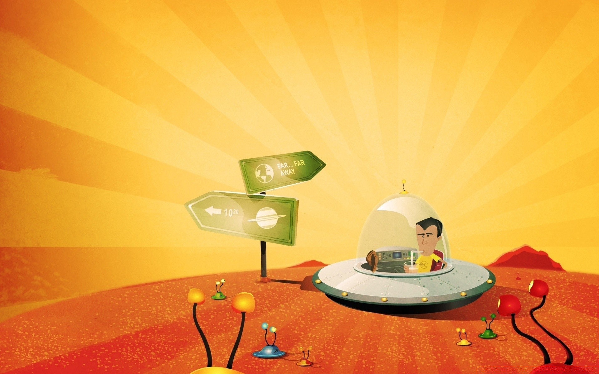 Homem de desenho animado em um disco voador está em um campo vermelhoHomem de desenho animado em um disco voador está em um campo vermelho