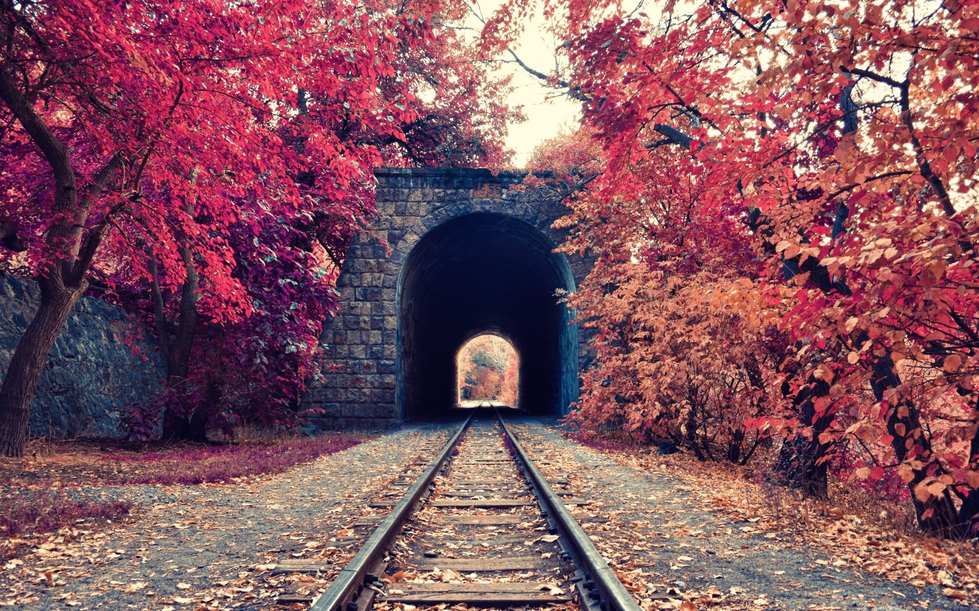 Túnel ferroviário na floresta do outono