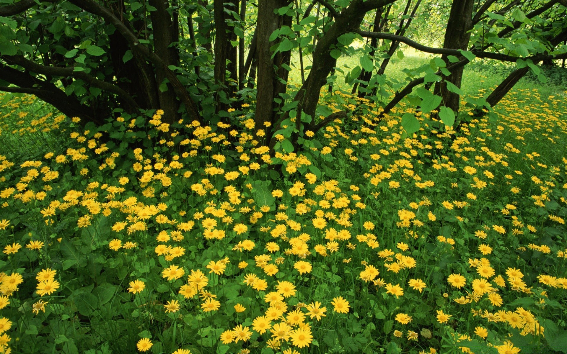 Clareira de flores amarelas na floresta
