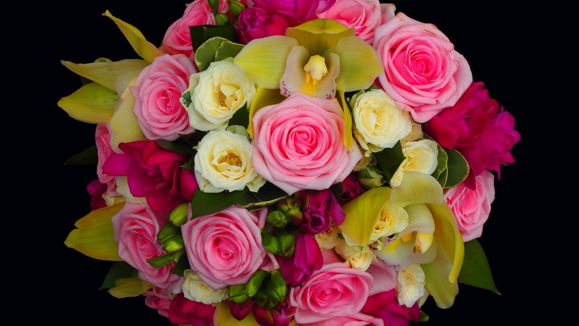 Lindo buquê de flores de rosas amarelas e rosa em pacote