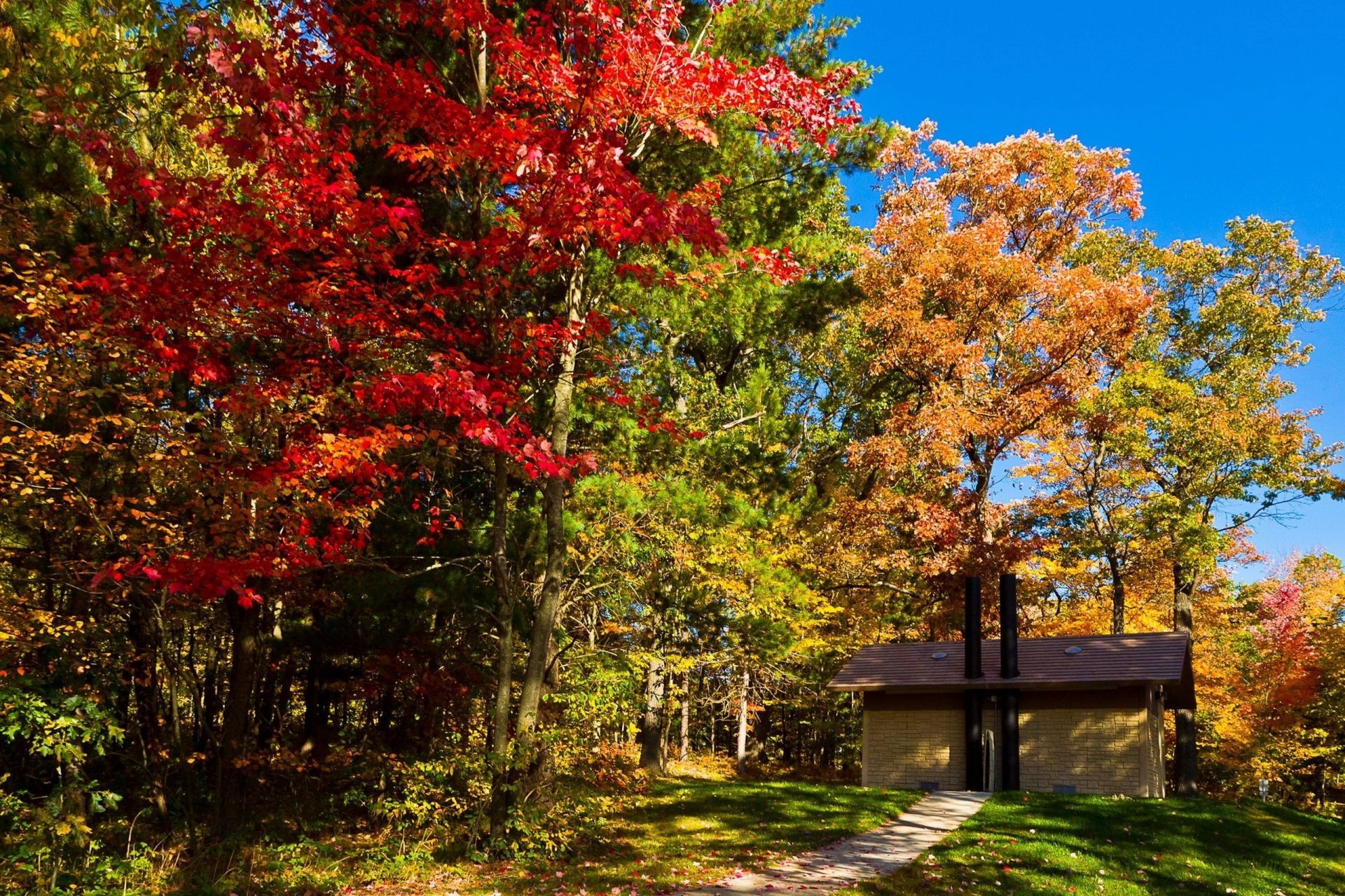 Paisagem de outono de árvores com folhas amarelas e vermelhasPaisagem de outono de árvores com folhas amarelas e vermelhas