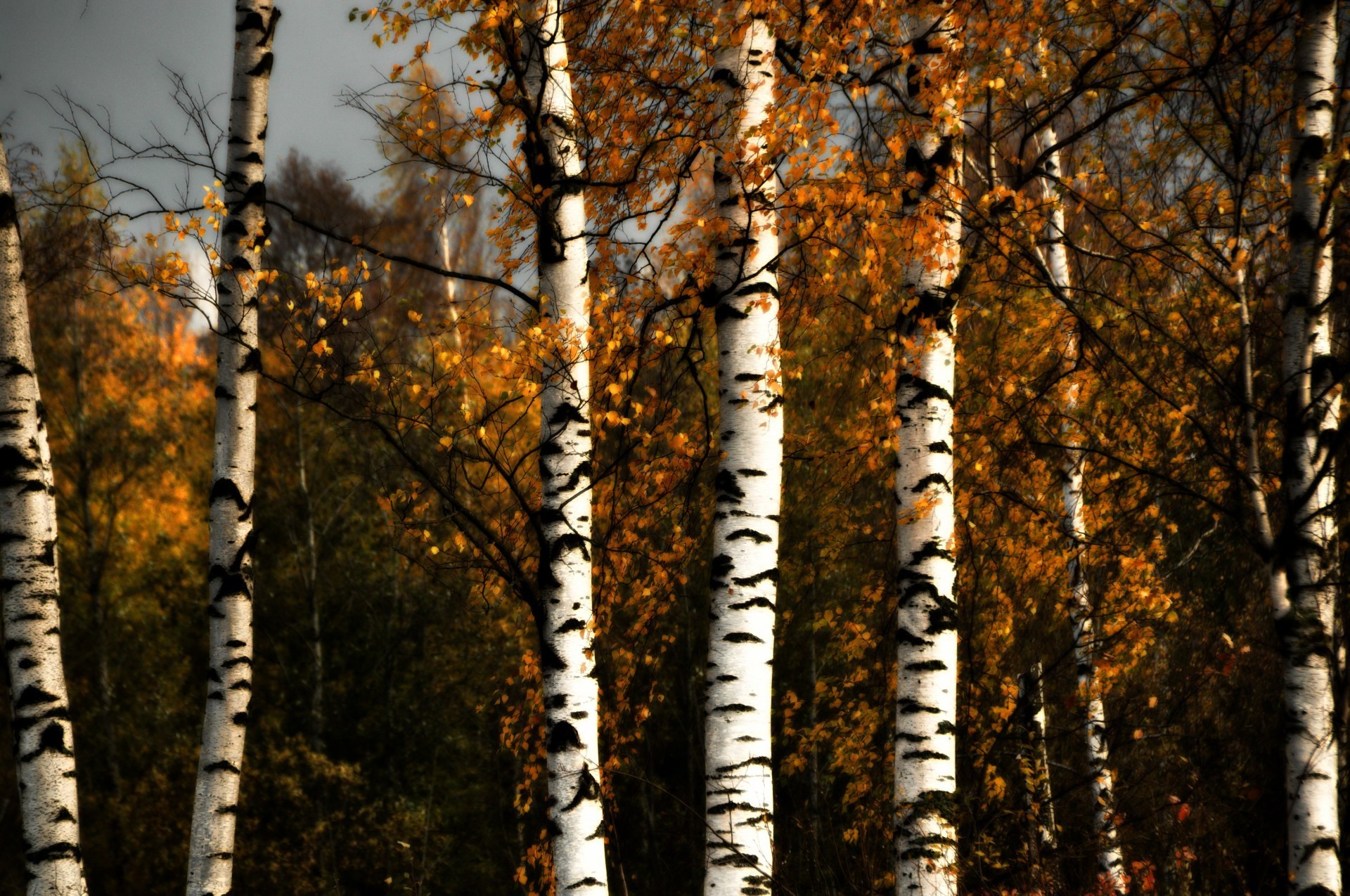 Troncos de bétulas brancas entre as folhas amarelas, iluminados pelo sol do outono