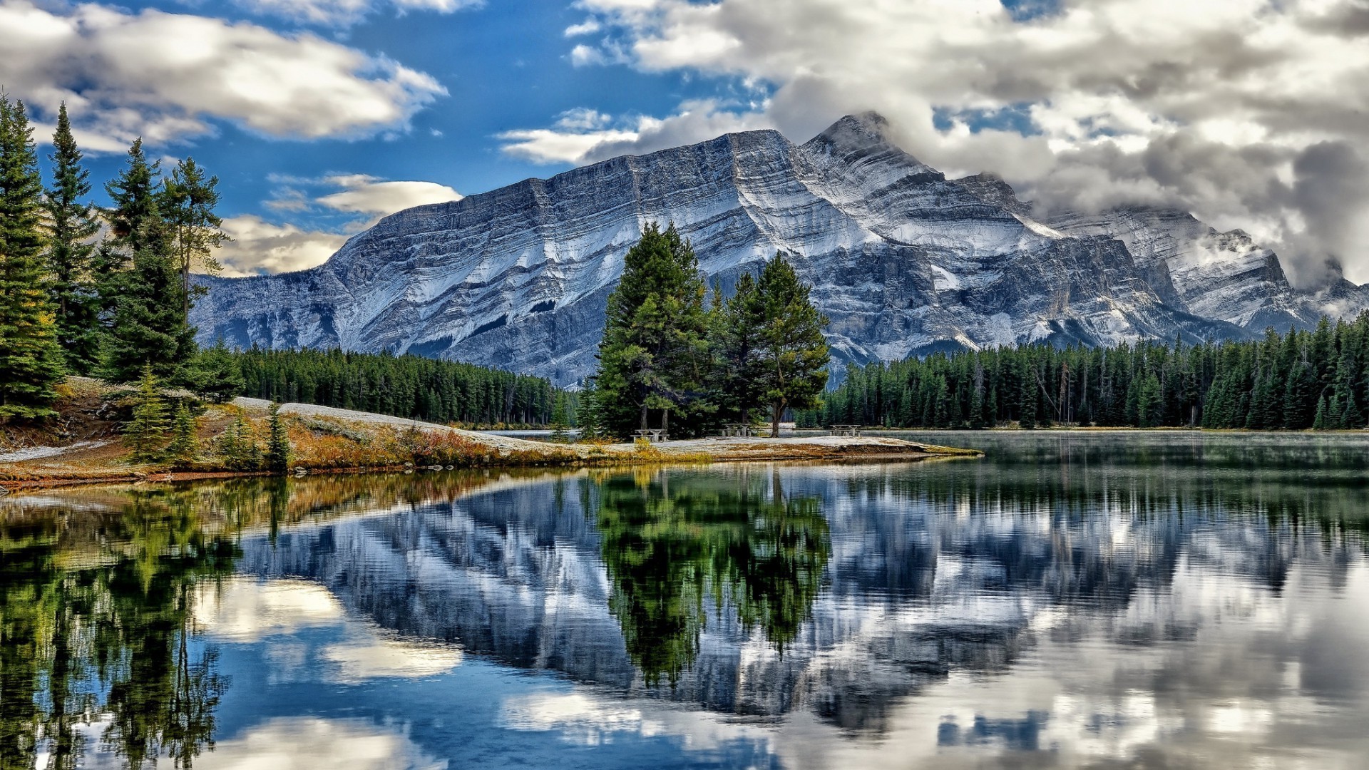 Reflexão das montanhas na superfície espelhada do lagoReflexão das montanhas na superfície espelhada do lago