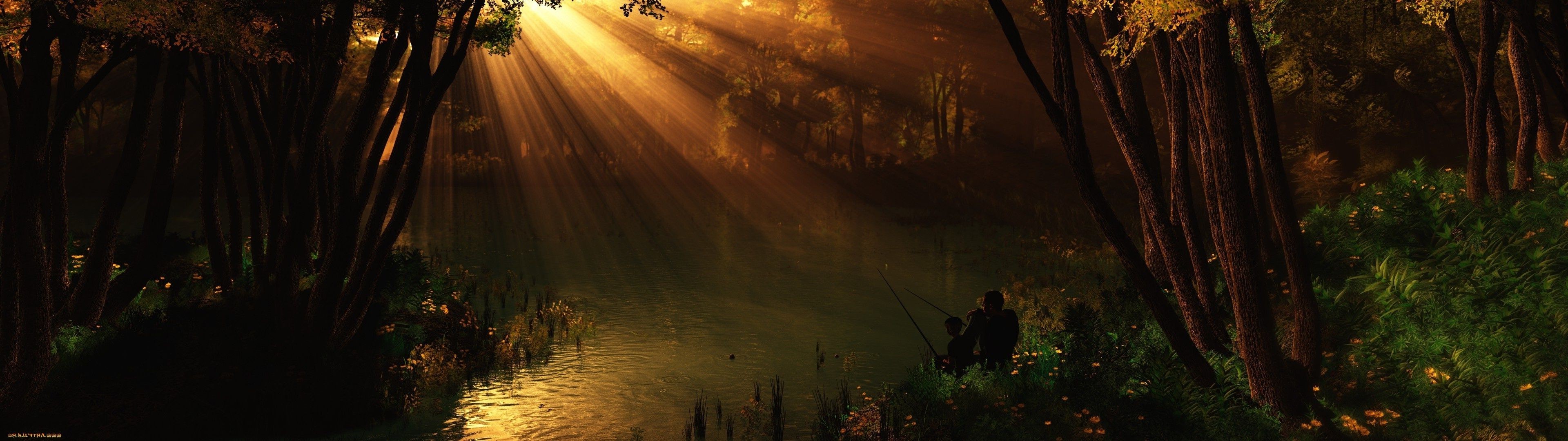 Árvores e pessoas no fundo do pôr do sol perto do rioÁrvores e pessoas no fundo do pôr do sol perto do rio