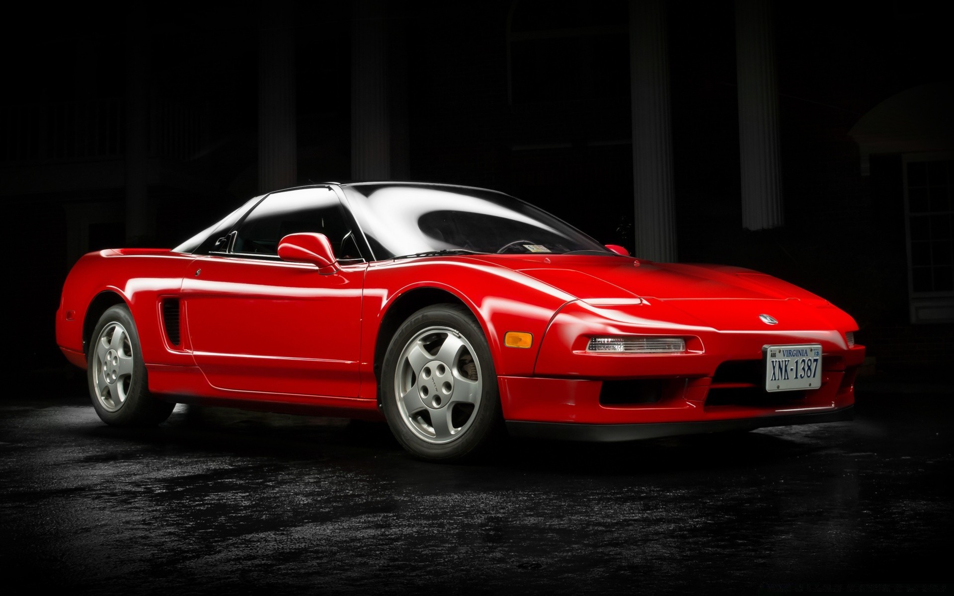 Carro esportivo vermelho no meio de uma estrada estreita contra árvores de outono