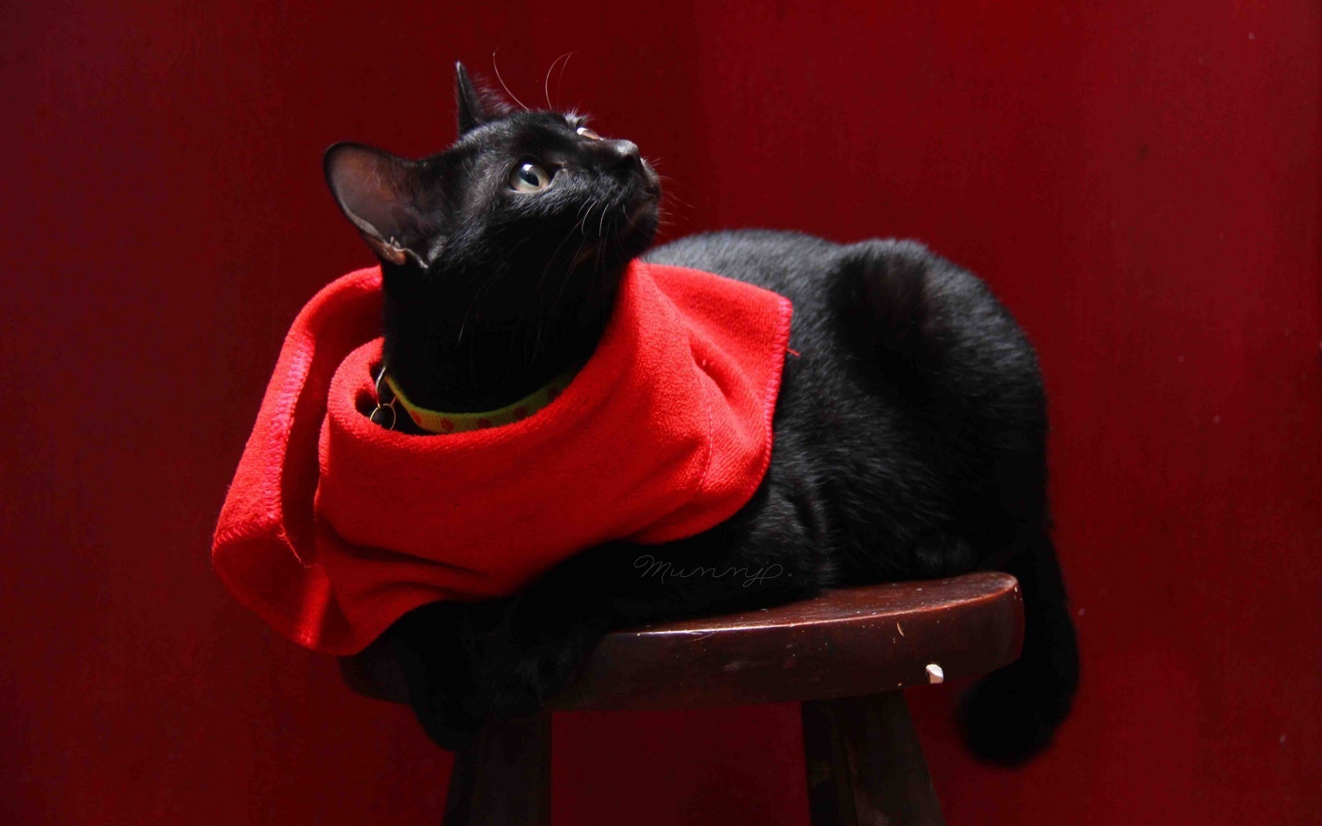 Um gato em um lenço vermelho senta-se em uma cadeira