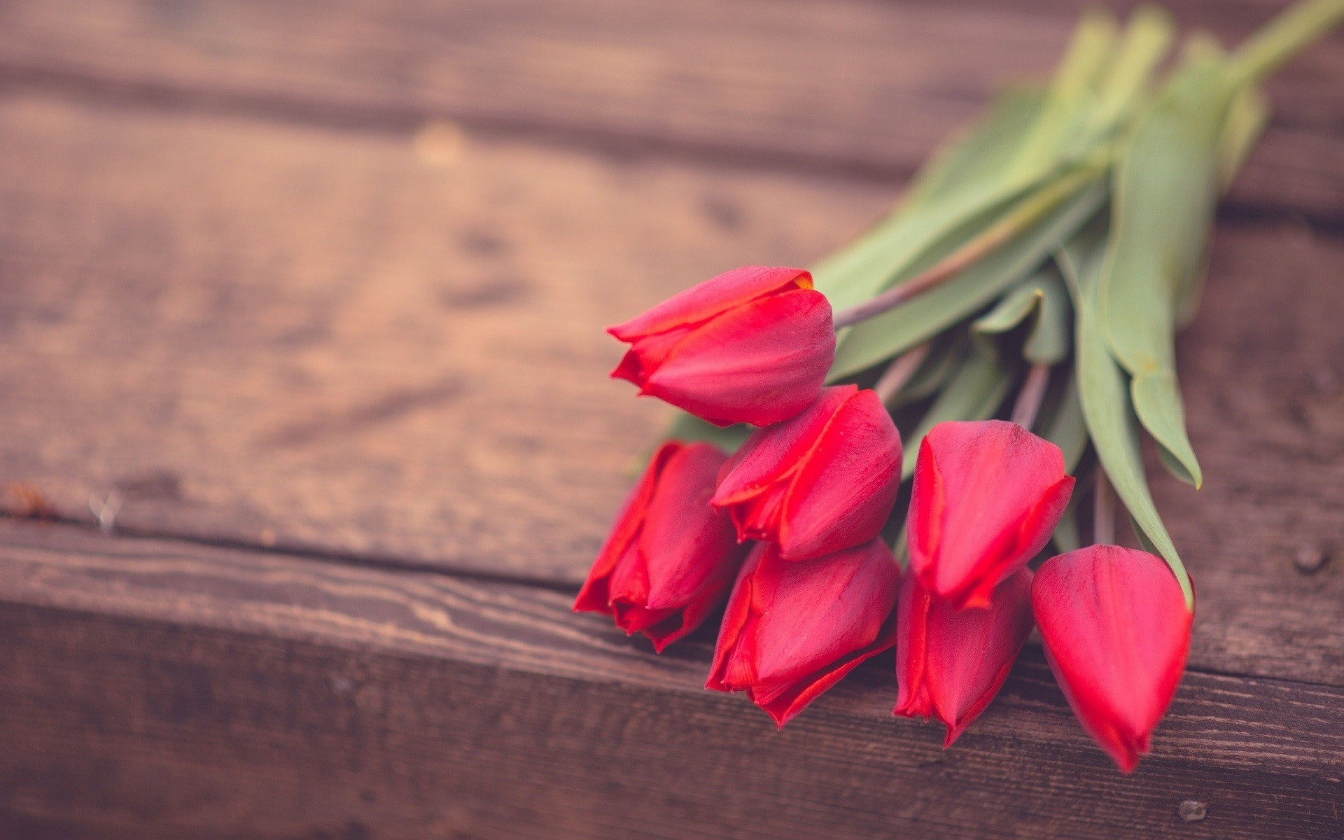 Sete tulipas vermelhas em tábuas