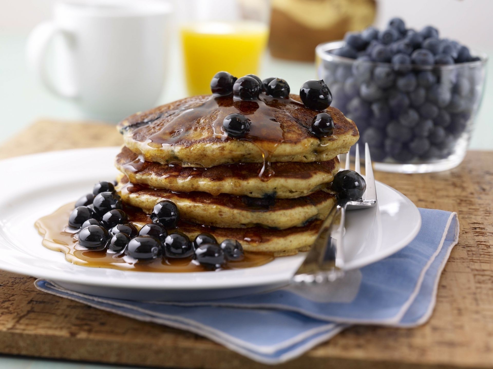 Panquecas de café da manhã com xarope de cunha e mirtilos