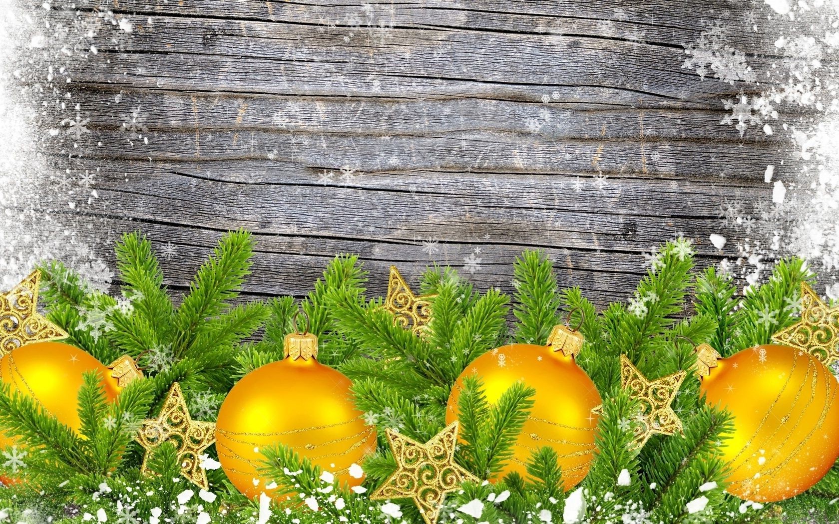 Bolas de ouro e estrelas em ramos de abeto