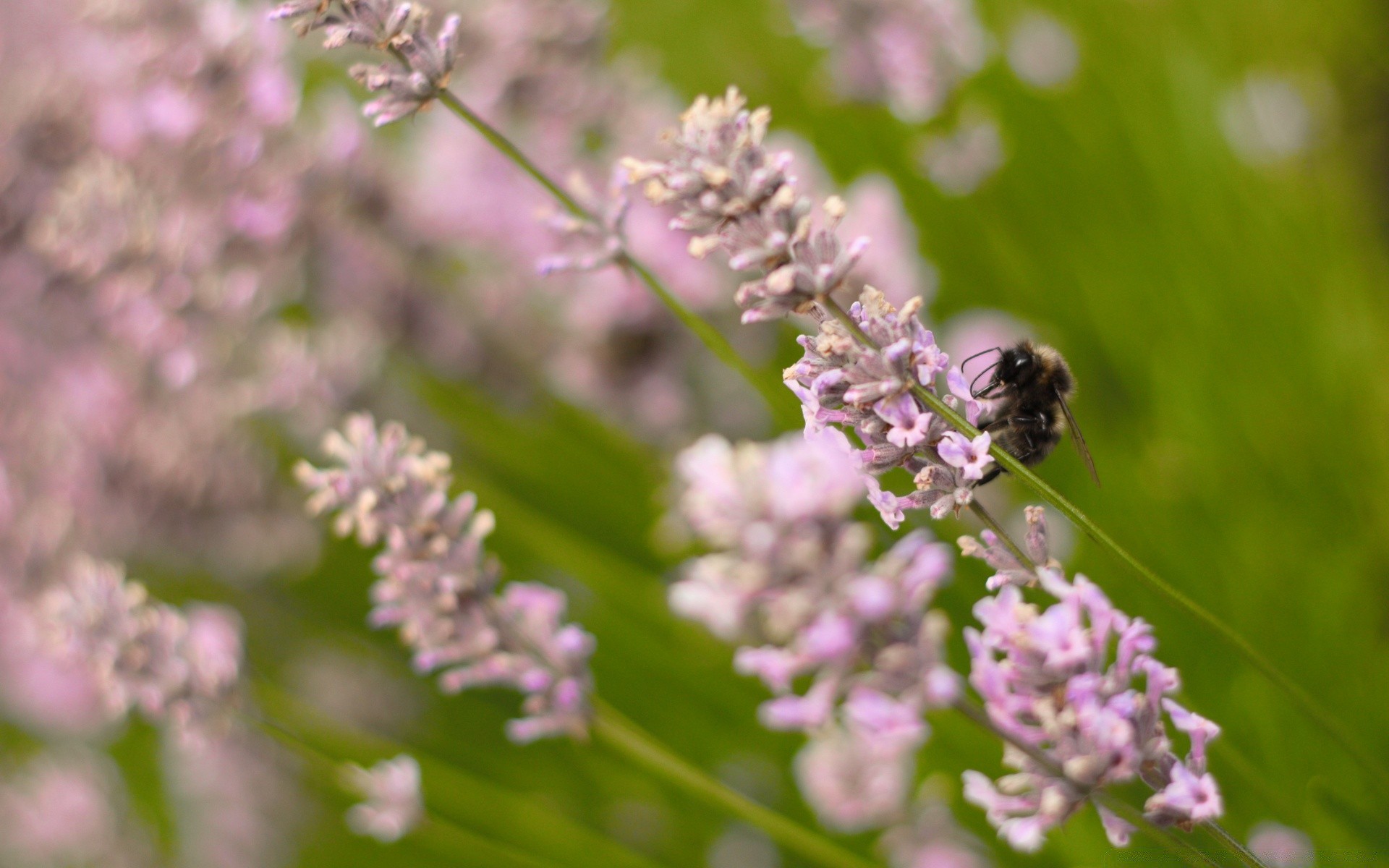 Uma abelha senta-se no talo de uma flor silvestre