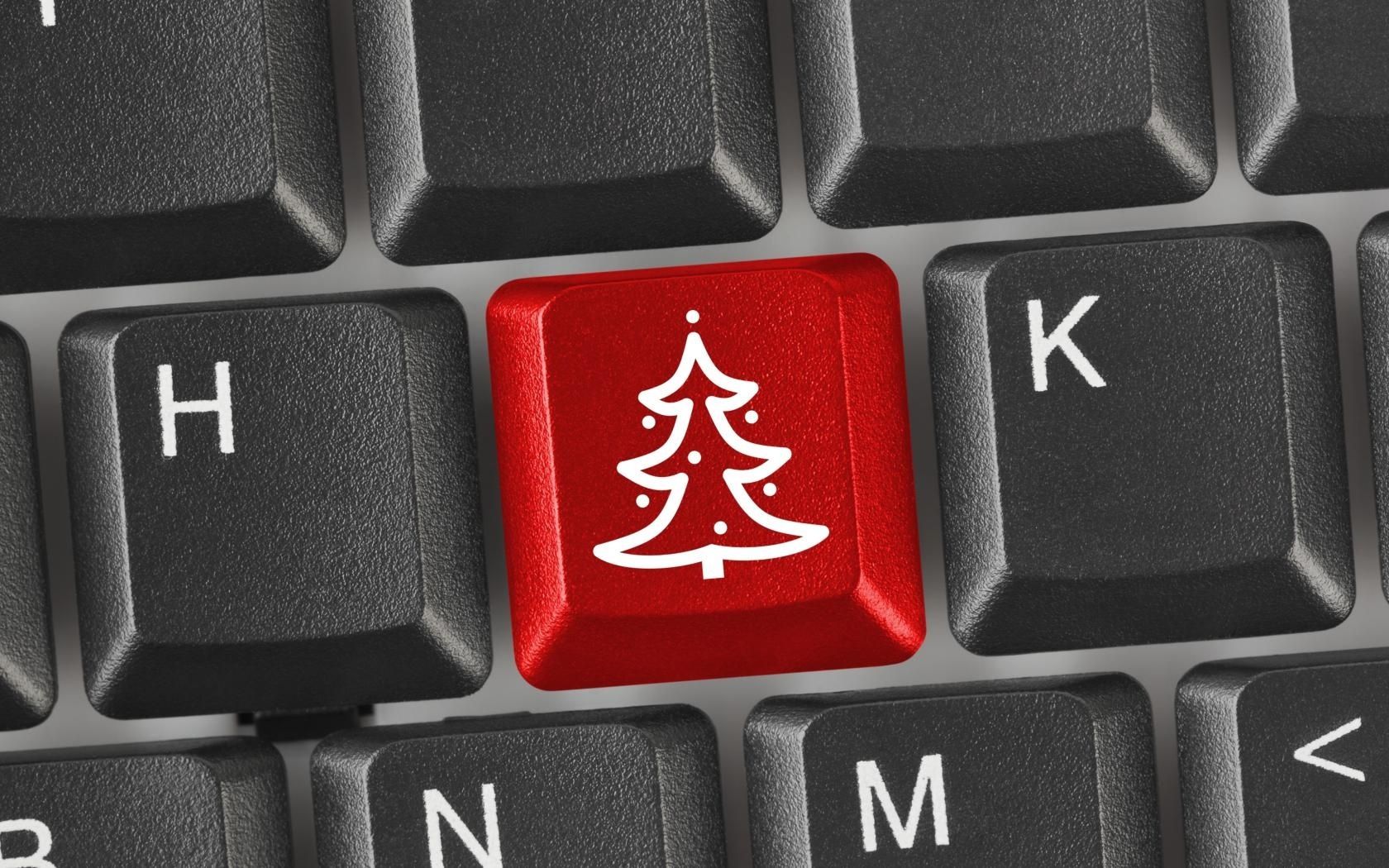Botão vermelho com imagem de árvore de Natal no teclado preto