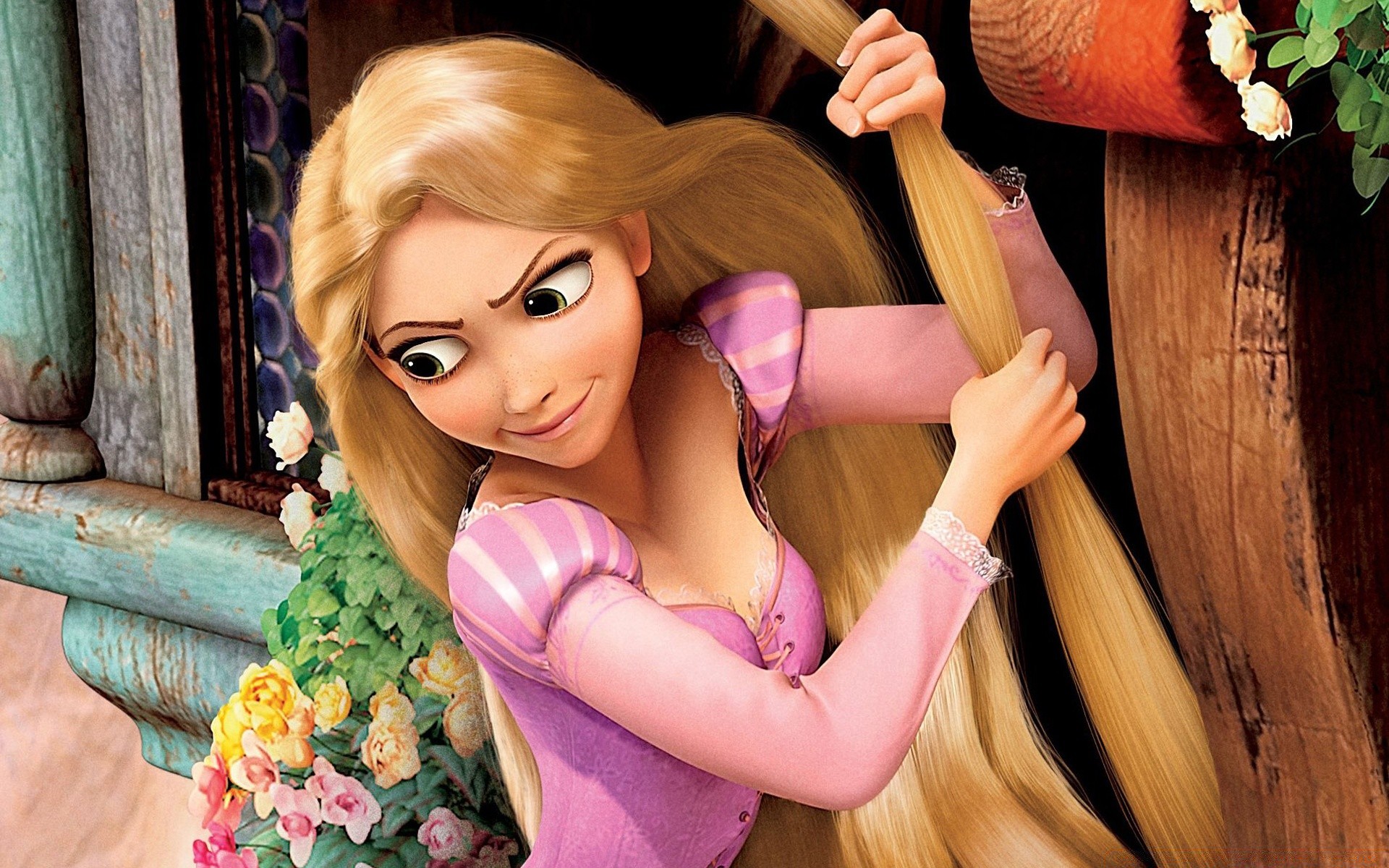 A rapariga do desenho animado Rapunzel. Rapunzel na torre