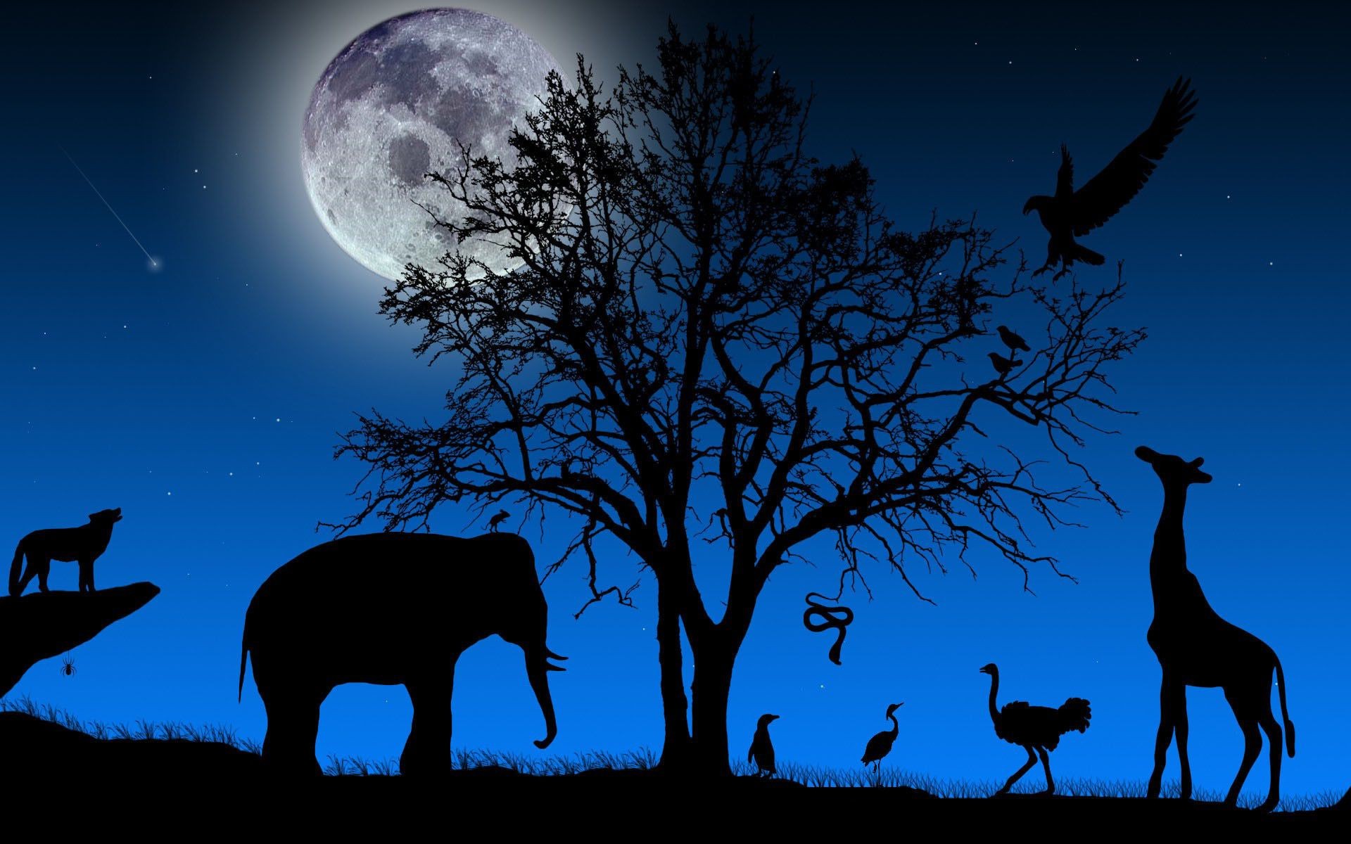 Vários animais à sombra da lua