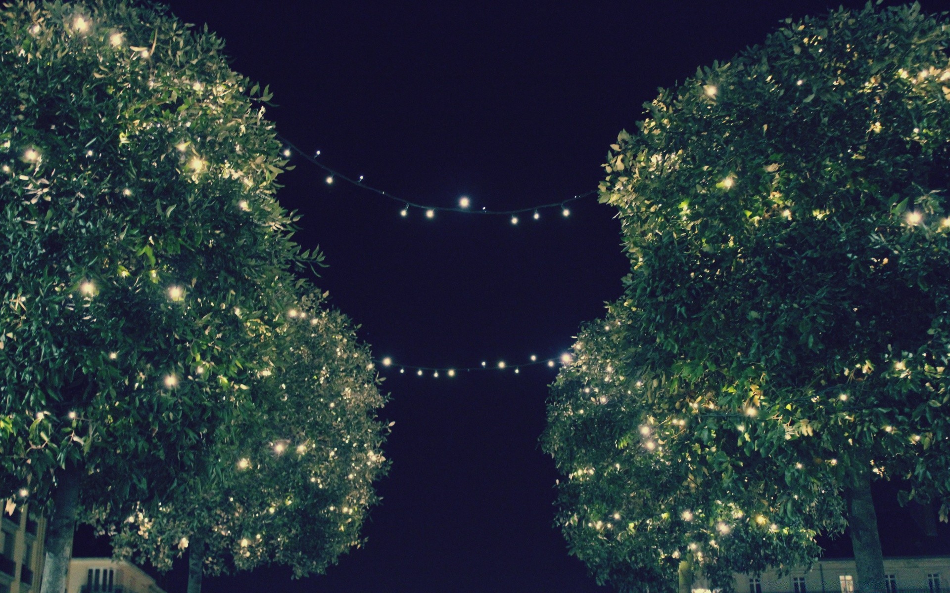 Árvores decoradas com guirlandas de Ano Novo no escuro