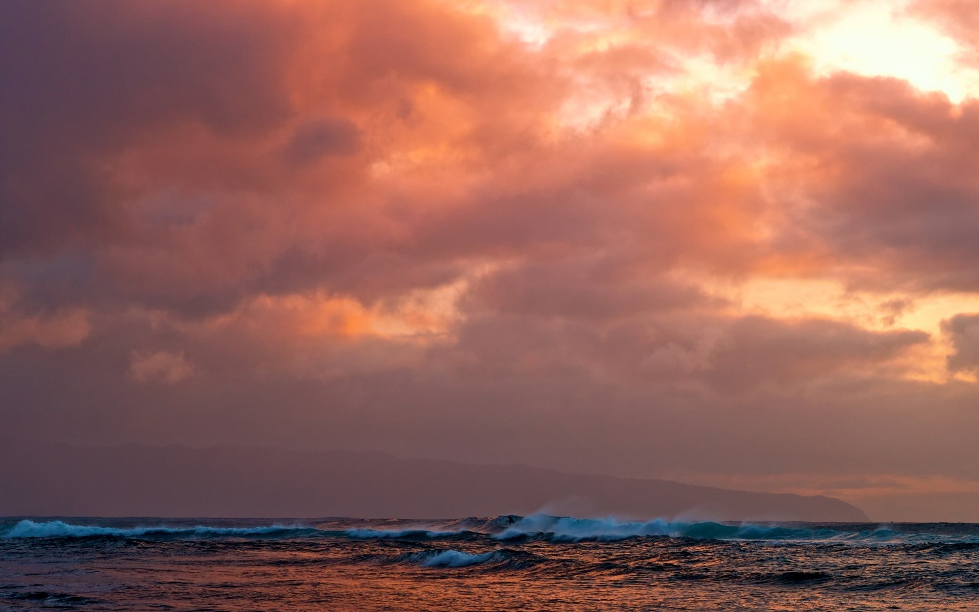 Palmeiras na praia ao anoitecer com vista para o pico da montanha e a Baía
