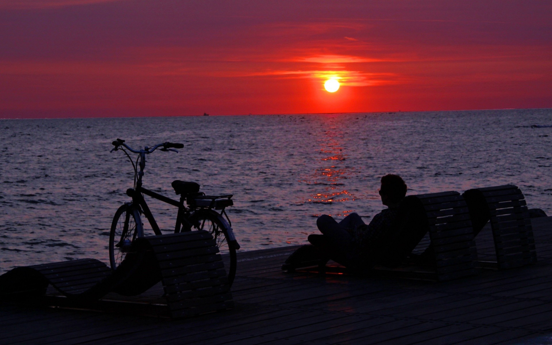 Homem ao pôr do sol à beira-mar com bicicleta