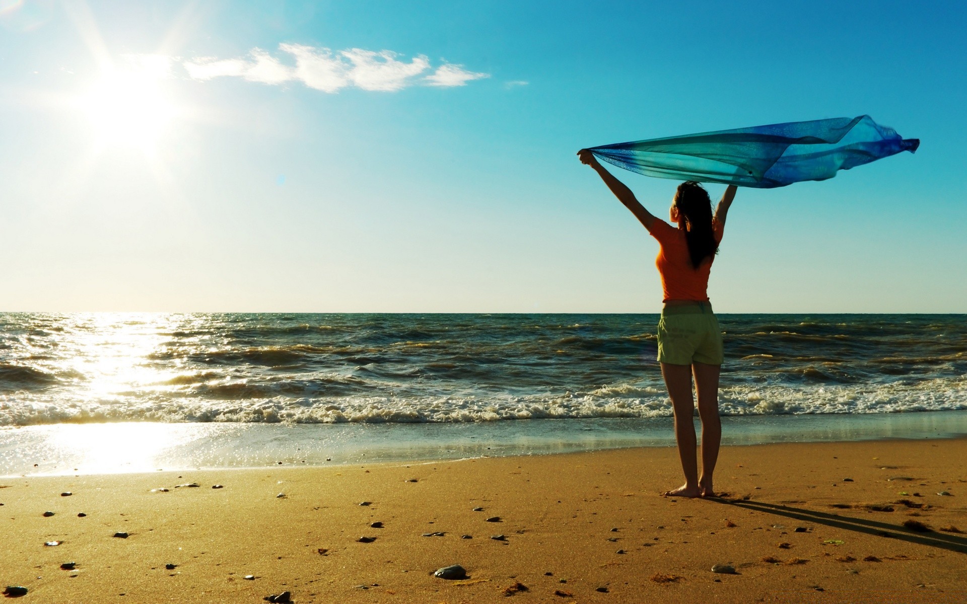 A rapariga do pareo na praia. Areia amarela e nascer do sol