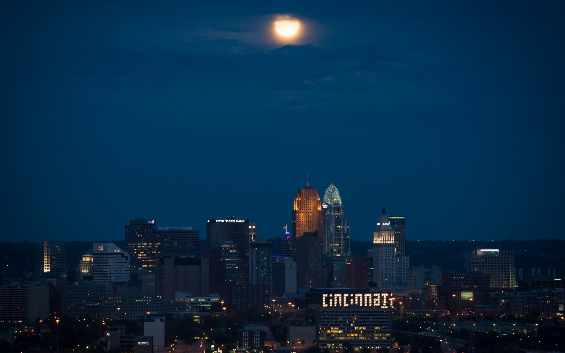 A cidade é lotada, boa arquitetura, luz das luzes e azul da água
