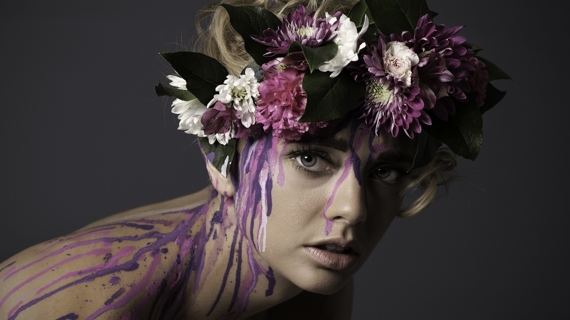 Mulher de arte corporal com uma grinalda de flores na cabeça