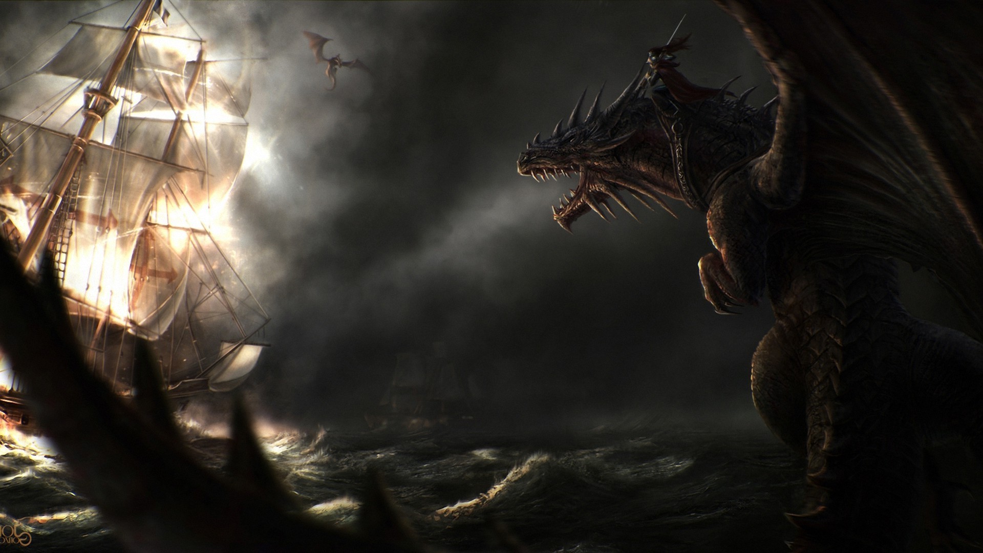 Veleiro em clubes de fumaça em combate com um dragão do mar