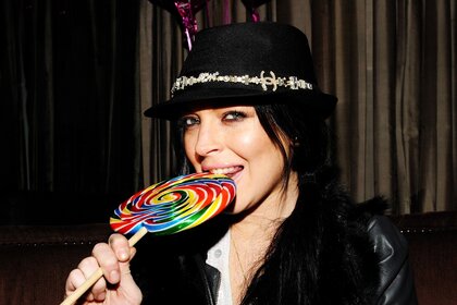 A rapariga do chapéu. Caramelo num pau. Menina com doces
