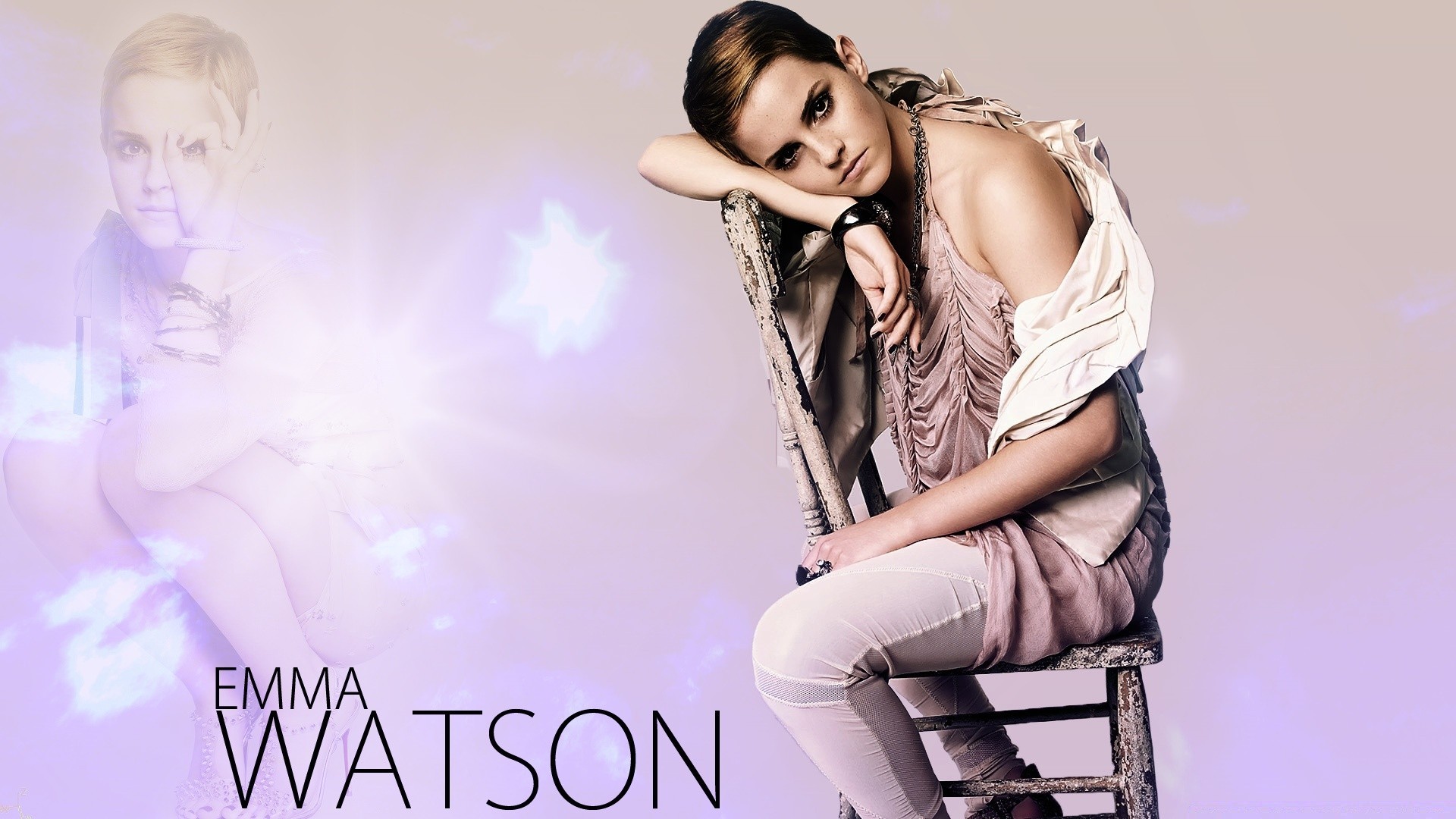 A atriz está sentada em uma cadeira