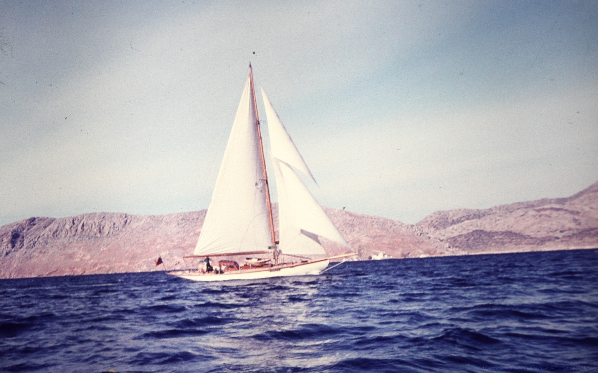 Veleiro no mar no fundo das colinas