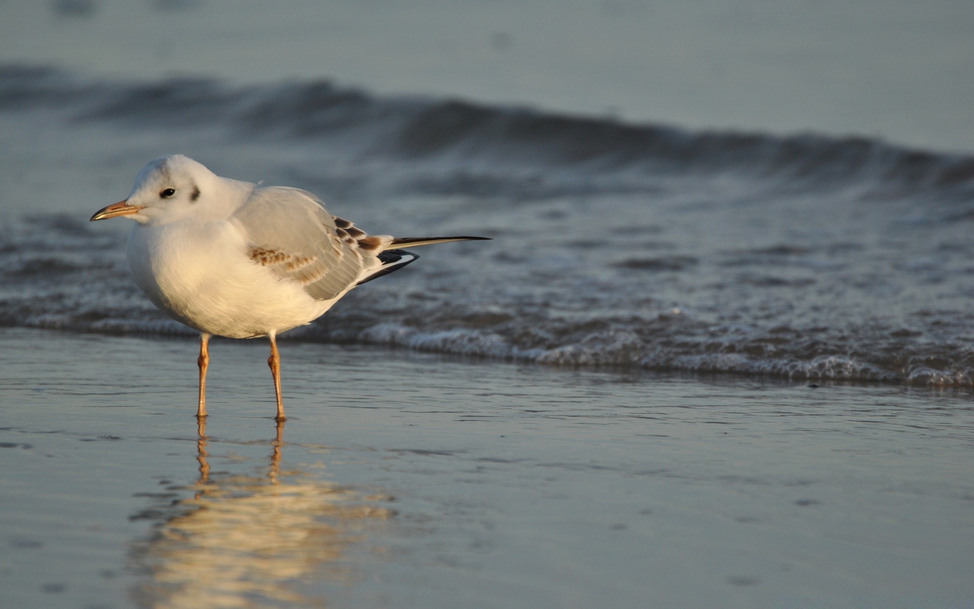 Pássaro olhando para um belo pôr do sol à beira-mar