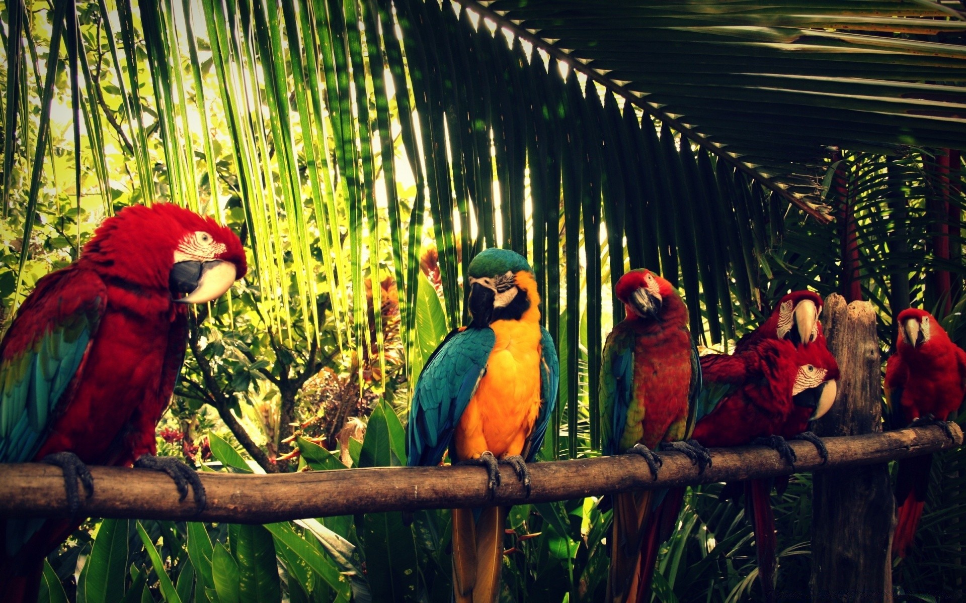 Dois papagaios vermelhos e azuis brilhantes voam