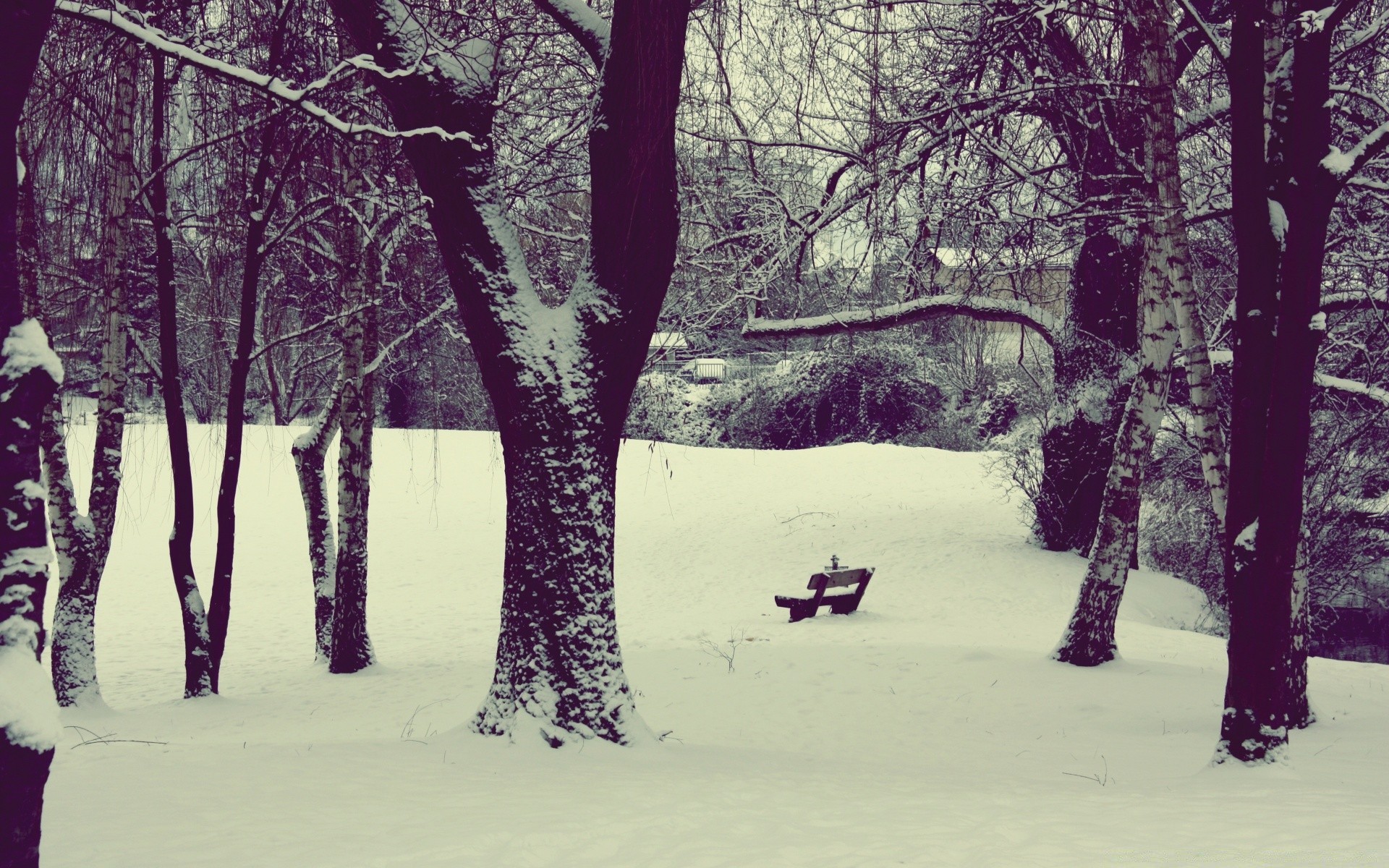 Um banco solitário em uma floresta coberta de neveUm banco solitário em uma floresta coberta de neve