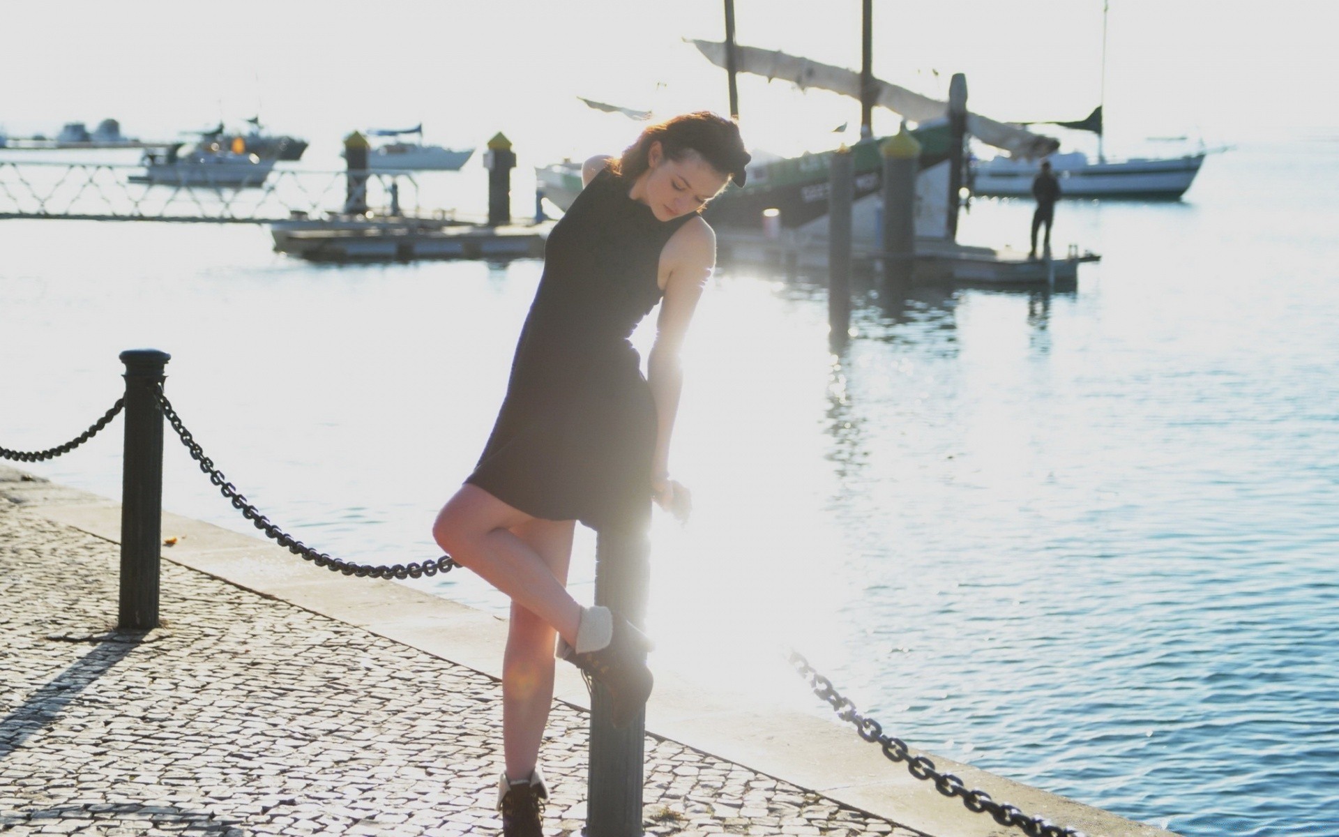 Menina em um vestido curto no cais repousa sobre um poste de metal